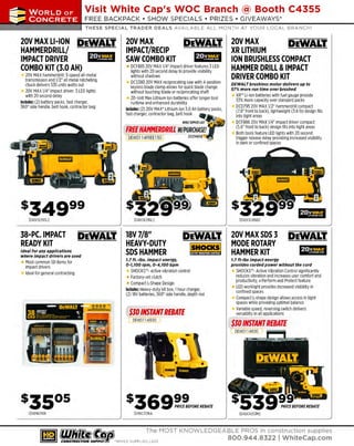 The document promotes a variety of tools and equipment for contractors available at White Cap's booth, featuring special offers and show deals on brands like Dewalt and Milwaukee. Attendees can meet Paul Jr. and participate in giveaways while learning about new products including drills, impact drivers, and safety equipment. The event includes promotions on combo kits and accessories, emphasizing both performance and safety for construction professionals.