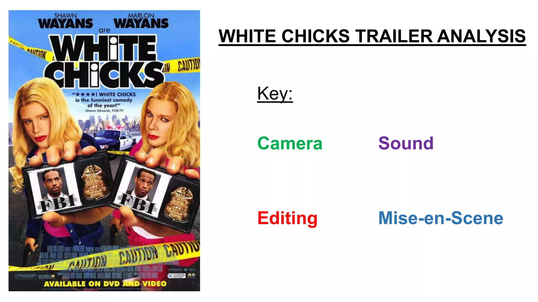 The trailer for the comedy film White Chicks uses various film techniques to introduce the plot and characters. It begins by establishing the two main characters as FBI agents who are given an undercover assignment to pose as wealthy white socialites. Various shots are used to highlight their transformation into the titular "white chicks" and the comedic discomfort that ensues from two black men passing as white women. The trailer effectively teases the fish-out-of-water story and struggle for the characters to settle into their new roles through dialogue, costumes, and their reactions. It concludes by identifying the film's director and genre to set audience expectations of a comedic take on gender bending and racial identity.