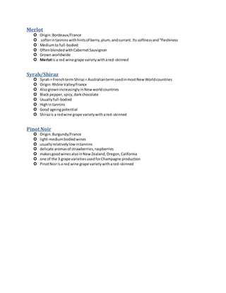 This document summarizes several popular white and red grape varieties used to make wine. It describes the origin, flavor profiles, and common styles of Chardonnay, Riesling, Sauvignon Blanc, Pinot Gris, Cabernet Sauvignon, Merlot, Syrah/Shiraz, and Pinot Noir. The grapes originate from major wine regions in France and Germany but are now grown worldwide. Each variety tends to produce distinct aromatic qualities and varying levels of acidity, tannins and body depending on region and winemaking techniques.