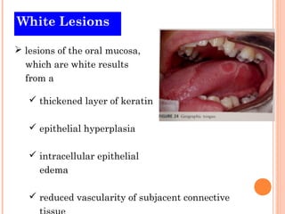 The document discusses various white oral lesions including leukoedema, leukoplakia, lichen planus, and candidiasis. Leukoedema is a common white lesion considered normal variation, while leukoplakia is a premalignant condition defined as a white patch that is not caused by other disease. Lichen planus is a chronic inflammatory disease presenting as bilateral white lesions, and candidiasis is an opportunistic fungal infection caused by Candida albicans.