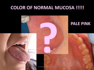 This document discusses white lesions of the oral mucosa. It begins by describing the normal color of oral mucosa and then defines white lesions as areas where the mucosa appears white in color. White lesions are classified as either keratotic or non-keratotic. Specific white lesions discussed in detail include frictional keratosis, nicotinic stomatitis, white spongy nevus, lichen planus, hairy leukoplakia, and leukoplakia. Non-keratotic white lesions discussed are burns, candidosis, and leukodema. For each lesion, the document discusses characteristics such as prevalence, appearance, histopathology, and treatment. The document is authored by
