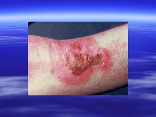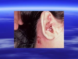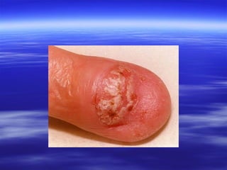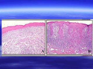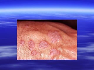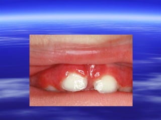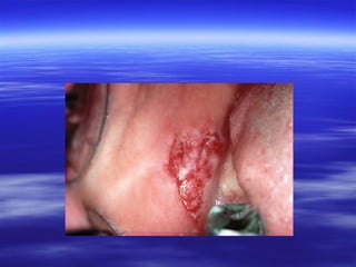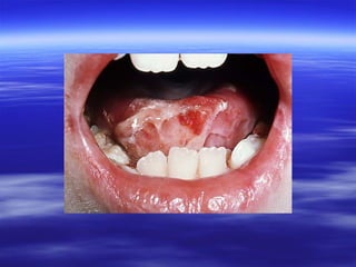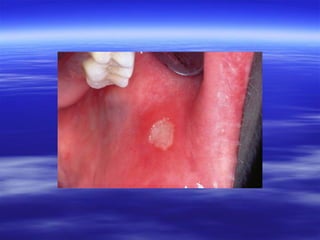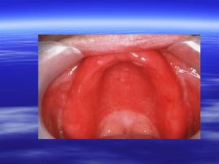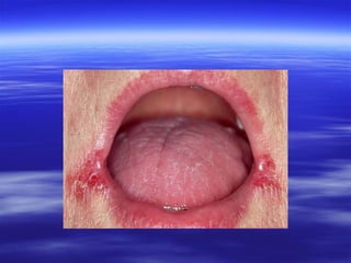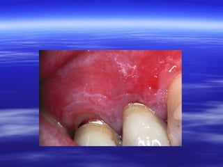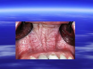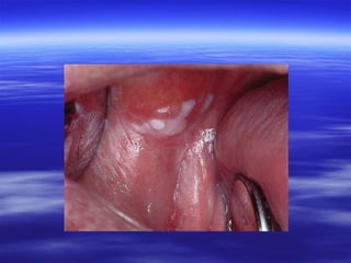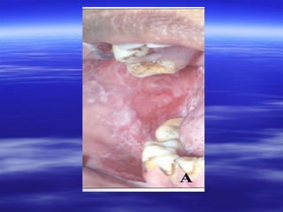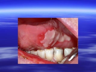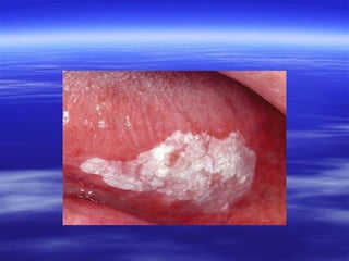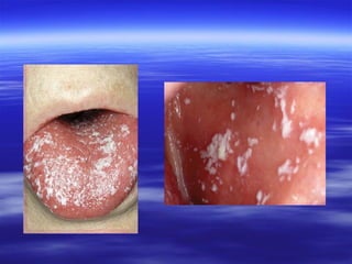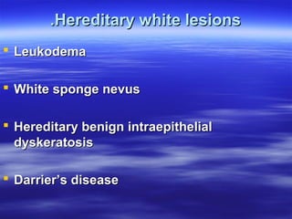 This document discusses various types of red and white lesions that can occur in the oral mucosa. It describes hereditary lesions including leukodema, white sponge nevus, and hereditary benign intraepithelial dyskeratosis. It also covers reactive/inflammatory lesions such as frictional keratosis. Infectious lesions covered include oral hairy leukoplakia caused by Epstein-Barr virus and various forms of oral candidiasis. Idiopathic "true" leukoplakia and erythroplakia are also discussed. Treatment options are provided for many of the conditions.