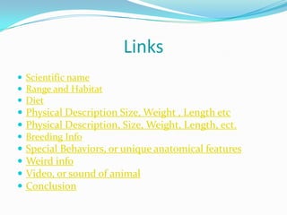 This document summarizes information about white lions. It provides details on their scientific name, habitat in South Africa, diet of whole dead animals, physical description including size and weight, breeding including litter size and age of reproduction, unique trait of white fur being caused by a recessive gene, and their endangered status with only 300 remaining in the world.