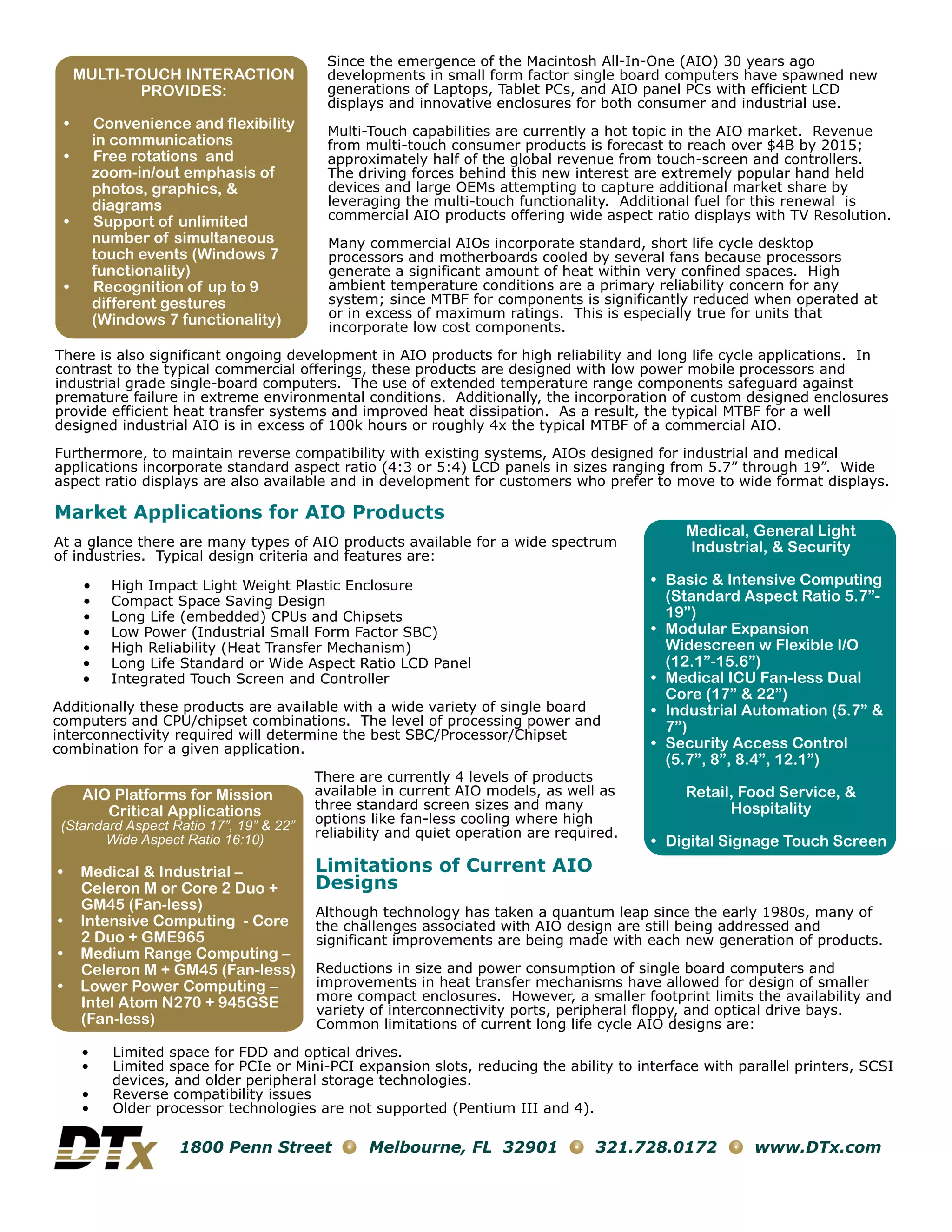DTx provides all-in-one (AIO) panel PCs for medical, industrial, and commercial applications. Multi-touch capabilities are driving increased revenue for AIO products. Industrial AIOs are designed for reliability with extended temperature components and efficient cooling, resulting in 4x the lifespan of commercial AIOs. AIOs are available in a range of sizes and aspect ratios to meet the needs of different industries like medical, manufacturing, and security. While technology has improved AIO design, limitations remain around expansion options and screen sizes. DTx works to overcome these through modular expansion and a variety of product options.