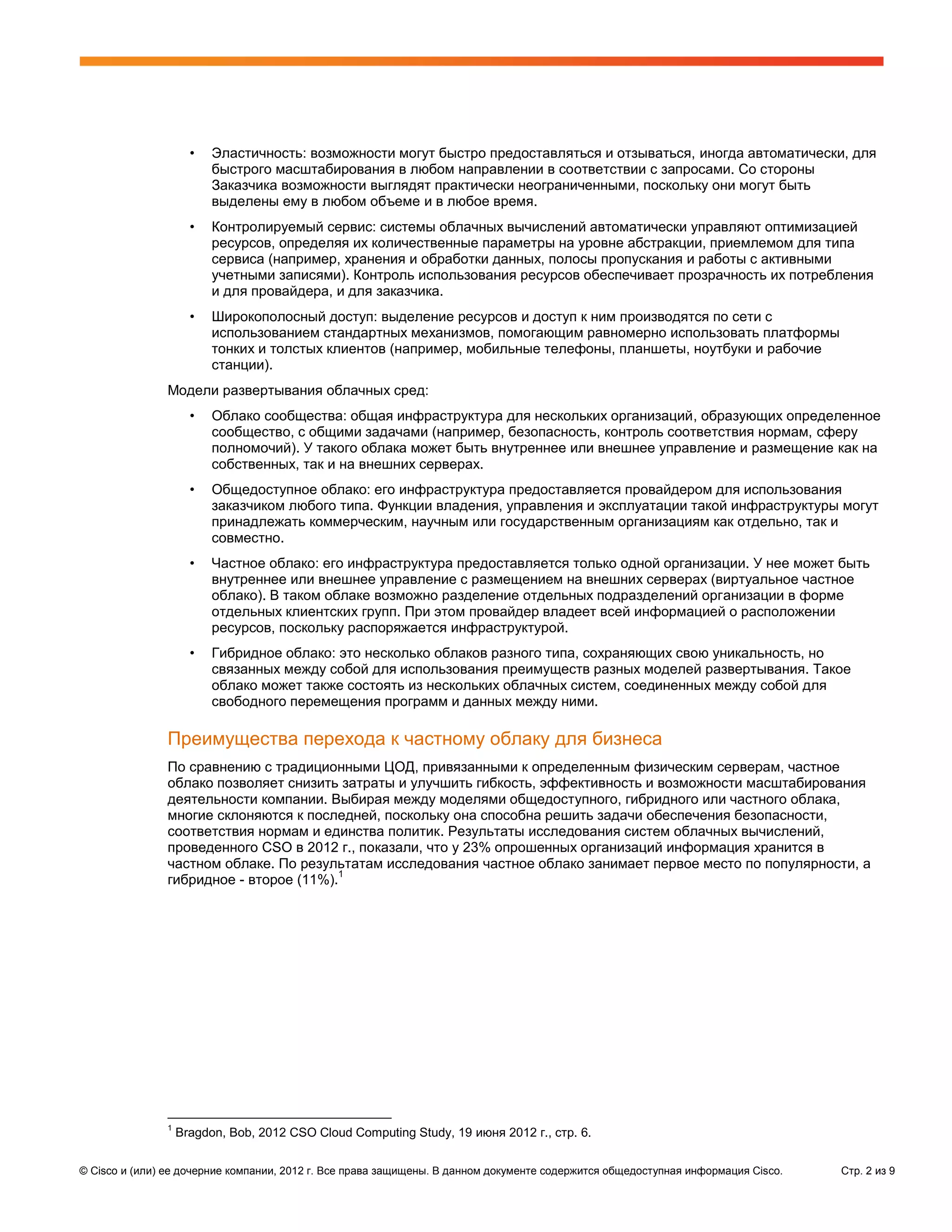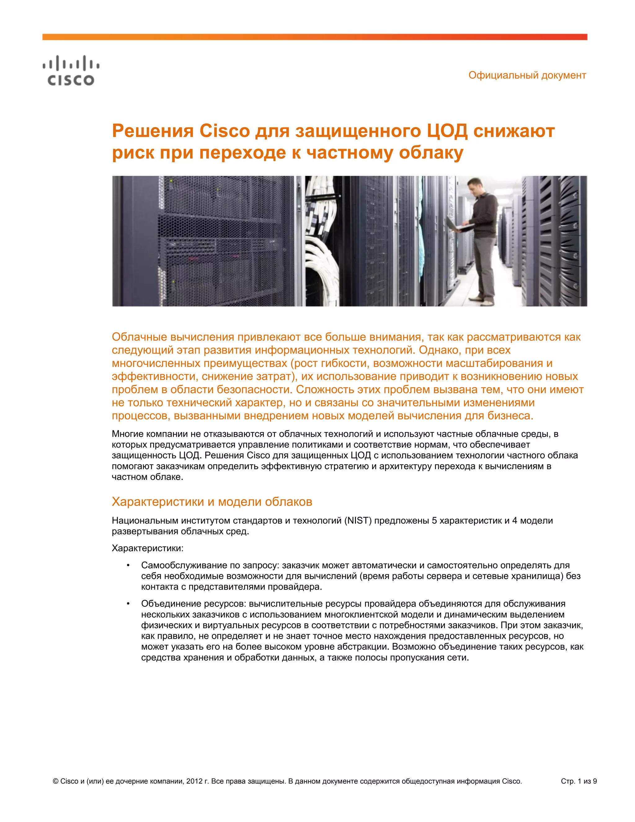 Документ описывает решения Cisco для безопасных центров обработки данных (ЦОД), которые помогают организациям перейти к частным облачным вычислениям, обеспечивая безопасность и соответствие нормативным требованиям. Он выделяет преимущества частных облаков, включая гибкость, эффективность и снижение затрат, а также обсуждает ключевые проблемы безопасности, возникающие при переходе к облачным технологиям. Cisco предлагает интегрированные системы и услуги для создания защищенной облачной инфраструктуры, что позволяет предприятиям оптимизировать свои ресурсы и улучшить защиту данных.