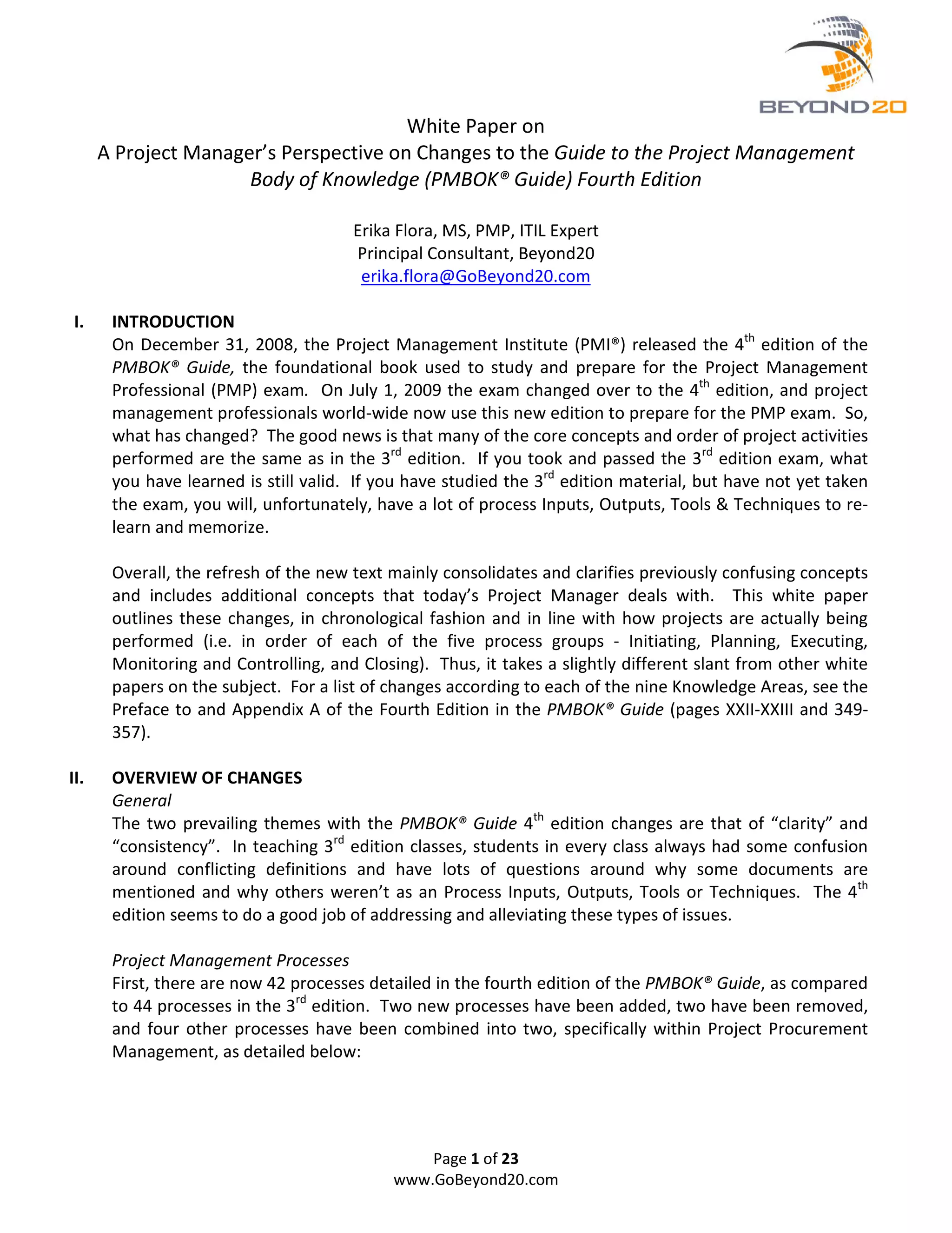 1) The PMBOK Guide 4th edition made several changes to clarify concepts and consolidate processes. It removed 2 processes, added 2 new processes, and combined 4 processes into 2.