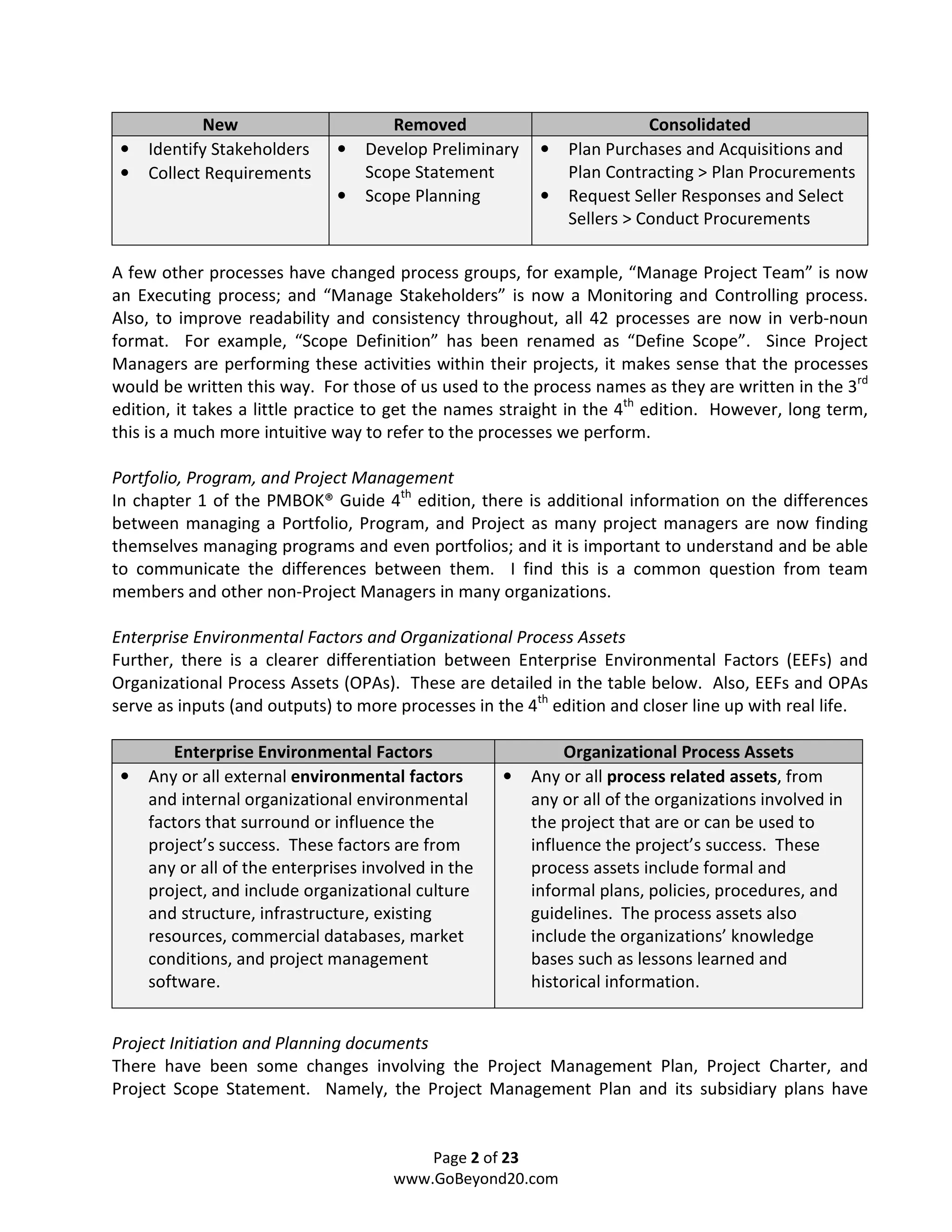 3) In the Initiating process group, it removed the Preliminary Project Scope Statement and added Identify Stakeholders. In Planning, it combined the 2 procurement processes and updated several process names to verb-noun format.