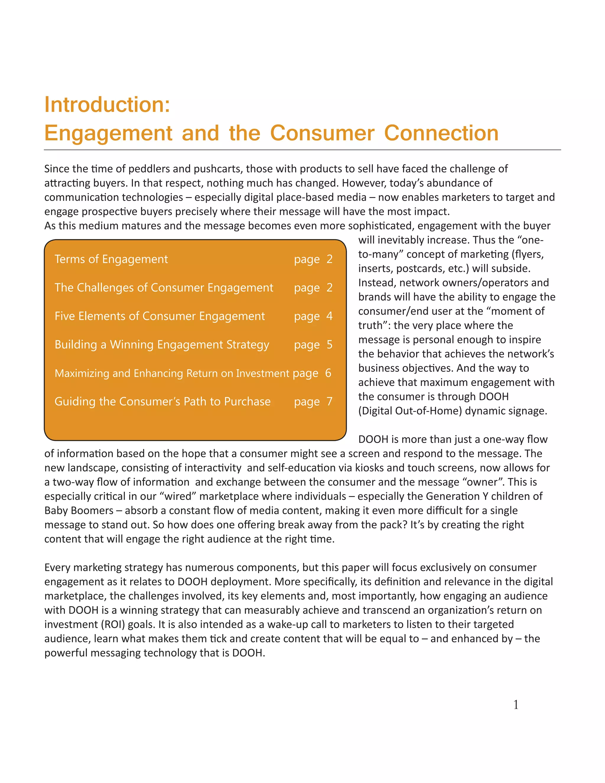 This document discusses how digital out-of-home (DOOH) media can be used to engage consumers along their path to purchase. It defines consumer engagement and outlines its importance in today's digital landscape. The document then discusses five key elements of effective consumer engagement strategies using DOOH media: knowing your audience well, creating an engaging experience, adding value, making emotional connections, and building loyalty through curiosity. It also provides guidance on how to build a winning engagement strategy using geo-targeting and transmedia approaches, and how to maximize return on investment through achieving objectives and enhancing consumer experience and engagement.