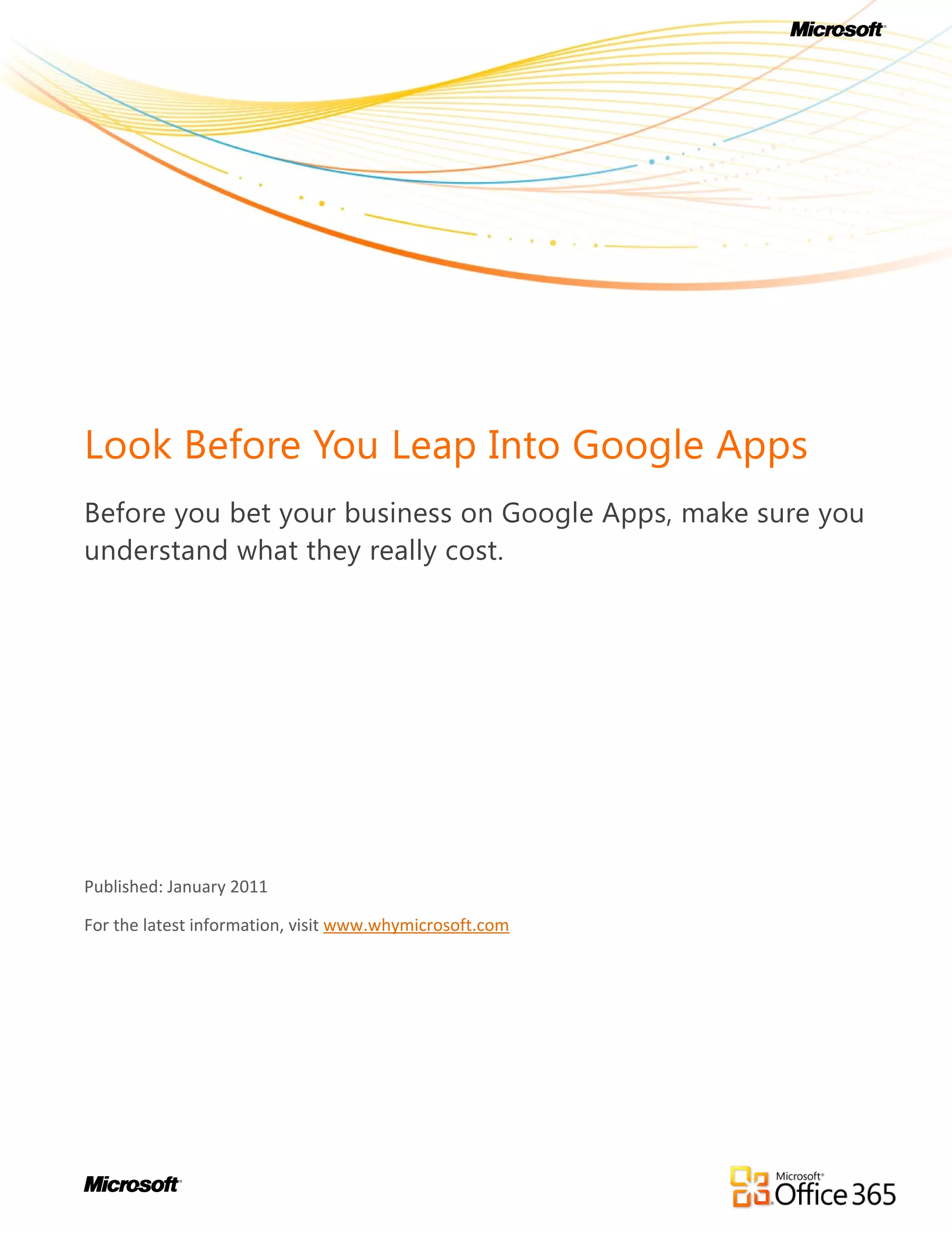 The document discusses the hidden costs associated with adopting Google Apps for business, emphasizing that while the initial price may seem low, the actual total cost of ownership (TCO) can be significantly higher due to deployment, IT support, and user training costs. It outlines challenges such as data migration, integrating with existing systems, limited features, and inadequate support necessitating additional investments in third-party applications. Ultimately, the document suggests that Microsoft provides a more reliable and comprehensive solution for productivity and collaboration needs.