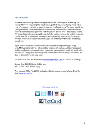 The iloop mobile whitepaper discusses the evolution and significance of mobile marketing, emphasizing the widespread use of mobile phones and how they can facilitate interactive consumer engagement through SMS marketing. It highlights the importance of personalized communication to avoid alienating consumers and outlines the benefits of 'smart alerts' and coupons that cater to consumer preferences and situational relevance. The document also details the functionalities of the iloop mobile platform, designed to optimize mobile marketing campaigns by leveraging data and analytics for enhanced consumer targeting and engagement.