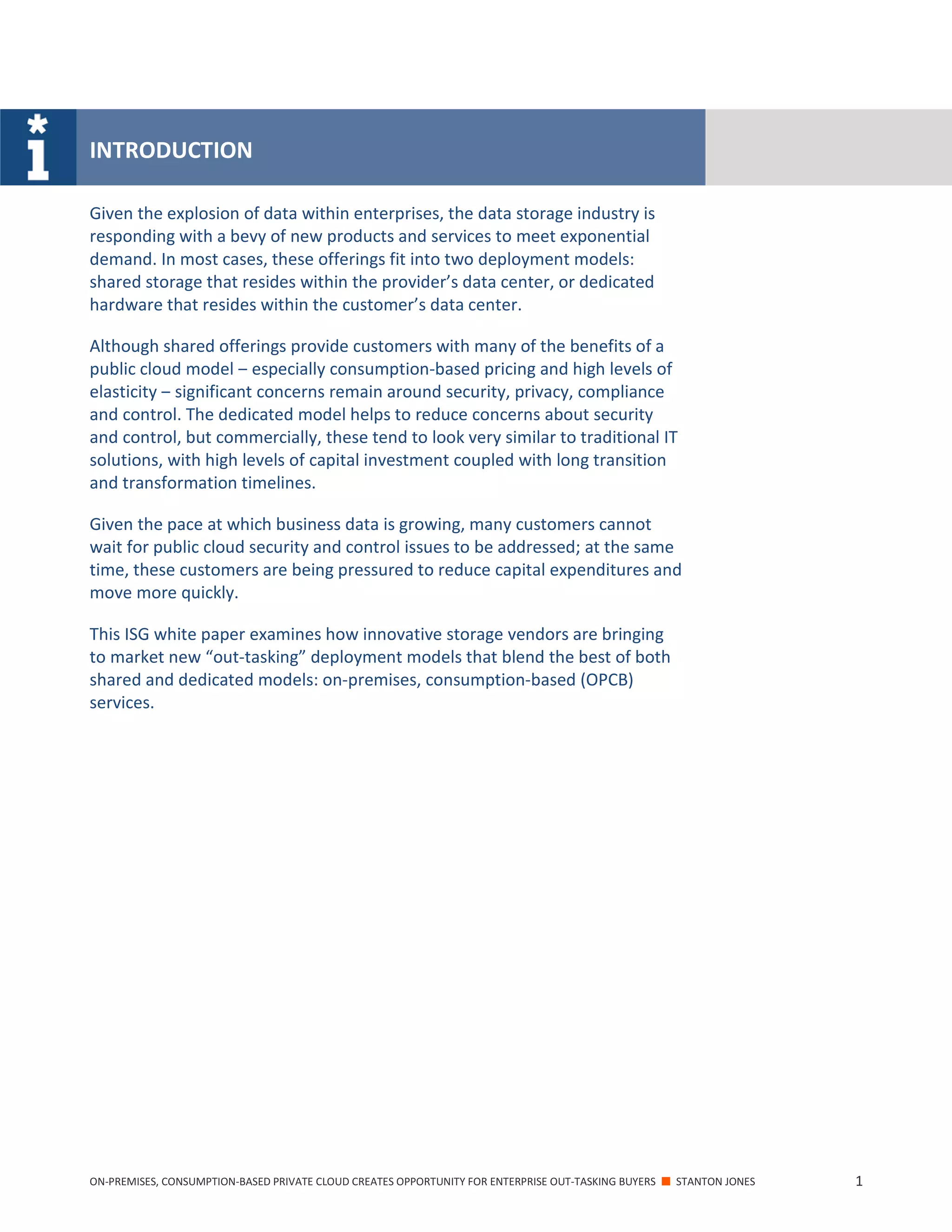The document discusses a new "on-premises, consumption-based private cloud" (OPCB) model for data storage that combines the benefits of public and private clouds. It provides flexibility and cost savings like public clouds through usage-based pricing, but with the security, control and data sovereignty of private clouds by storing assets on-site. The model addresses enterprises' needs to reduce costs while the pace of data growth prevents waiting for public cloud issues to be addressed. It evaluates this model for customers seeking data sovereignty and operational expenditure flexibility without full operational control loss.