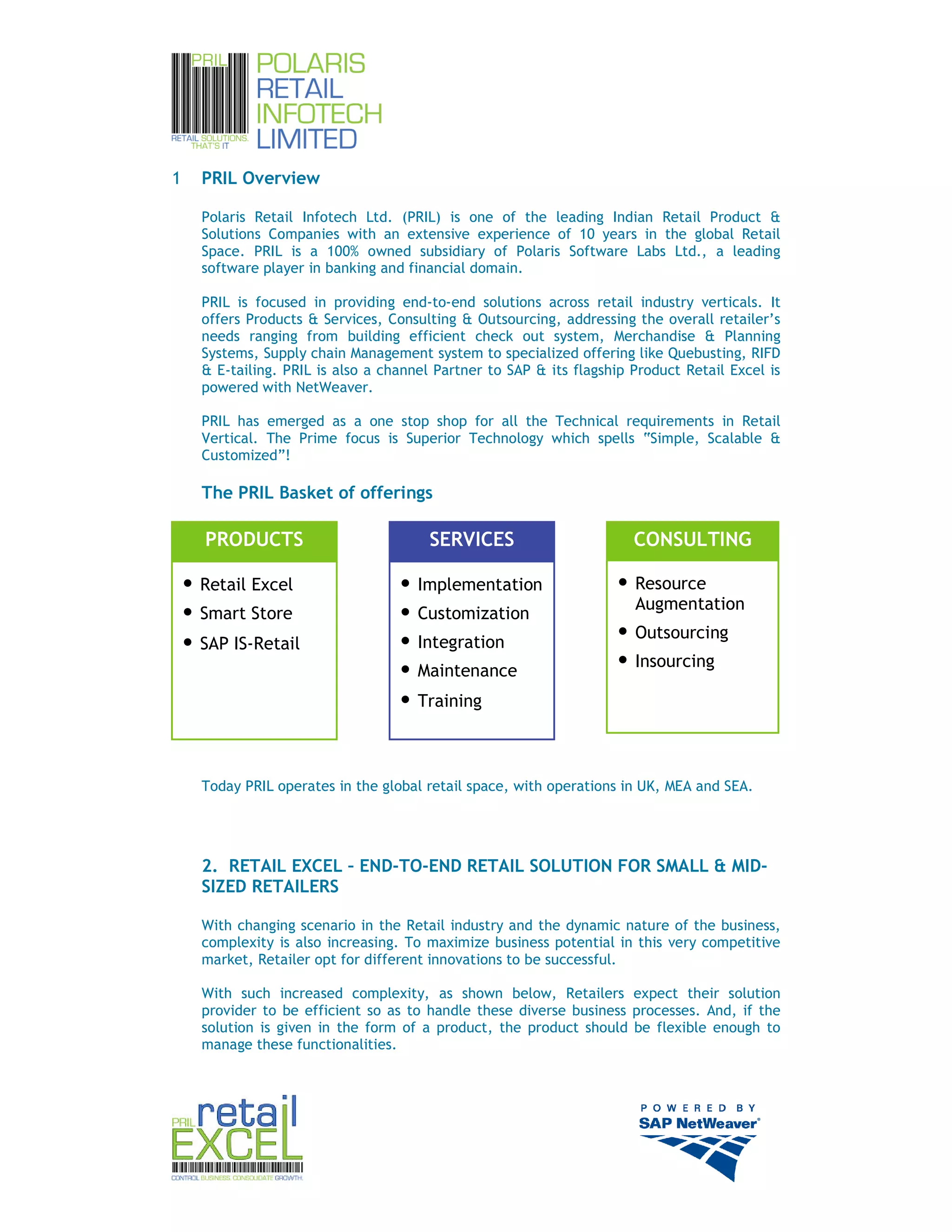 PRIL is an Indian retail solutions company that offers the Retail Excel product. Retail Excel is a complete end-to-end retail management solution for small and mid-sized retailers. It offers various modules like inventory, sales, procurement, accounting, and analytics to enable smooth store operations. Retail Excel provides flexibility in business rules, security, and the ability to manage global operations in multiple countries and currencies. It also allows for robust merchandise management functions.