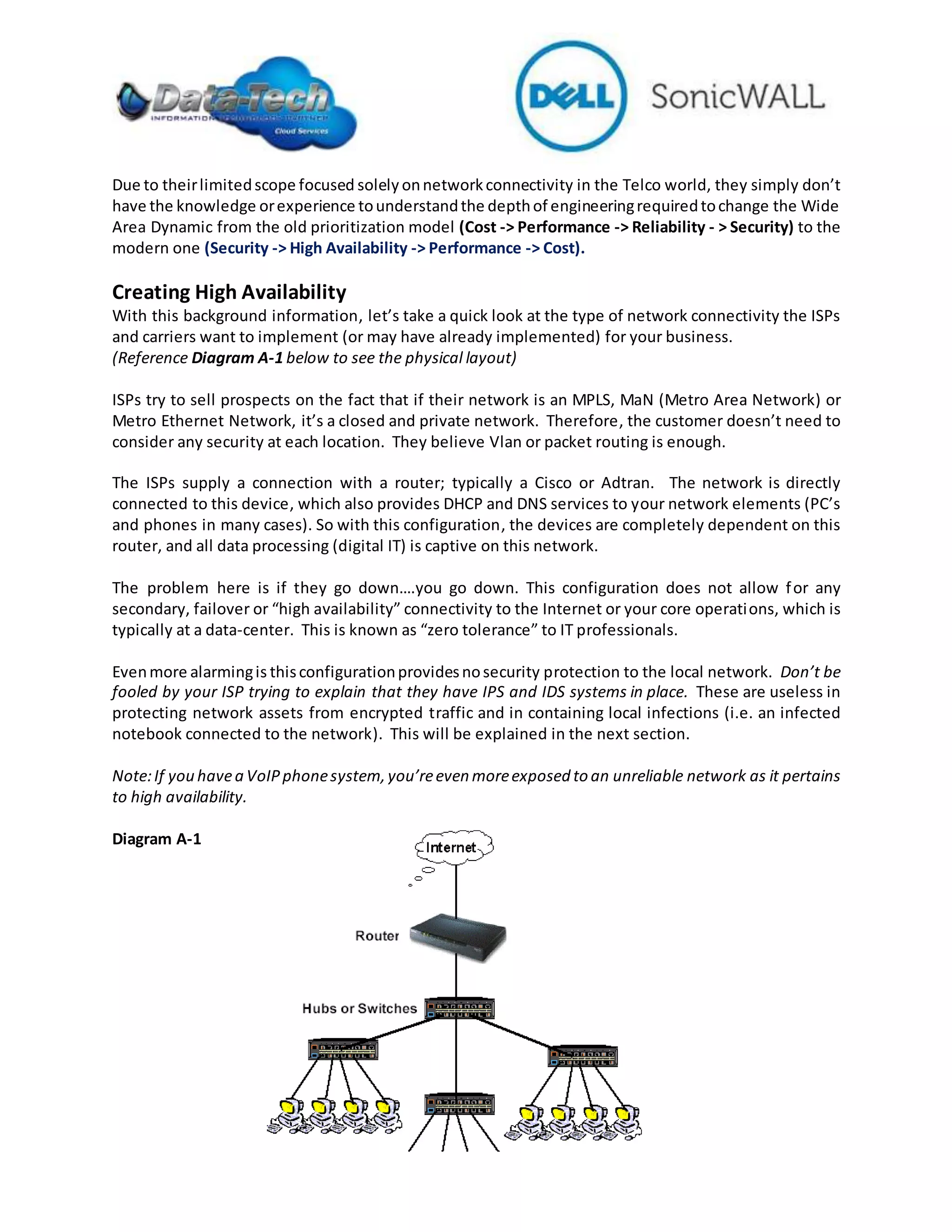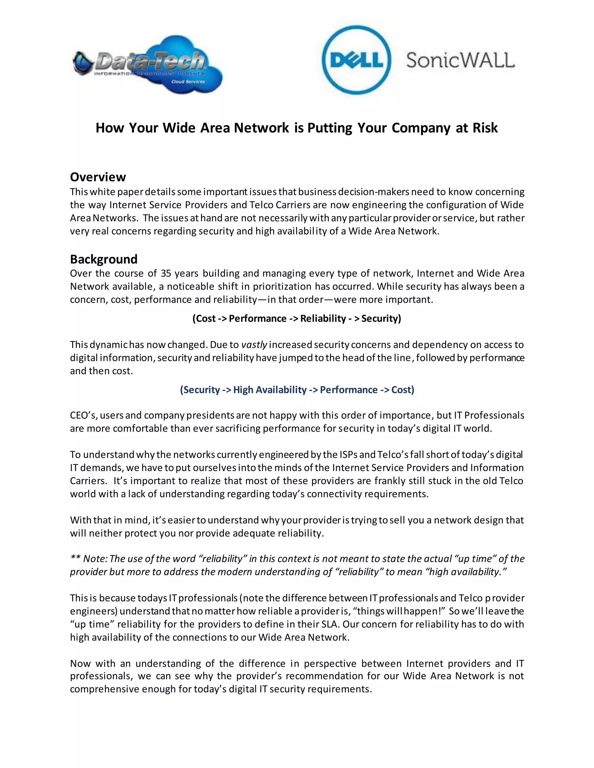 This document discusses how companies' wide area networks are at risk without proper security measures. It explains that internet service providers prioritize cost and performance over security. This leaves companies exposed to threats. The document recommends using a SonicWALL security appliance to create a highly available network with layers of protection, including application controls, traffic scanning, and encryption inspection. For a low monthly fee, this solution provides security, reliability, and regulatory compliance that traditional networks lack.