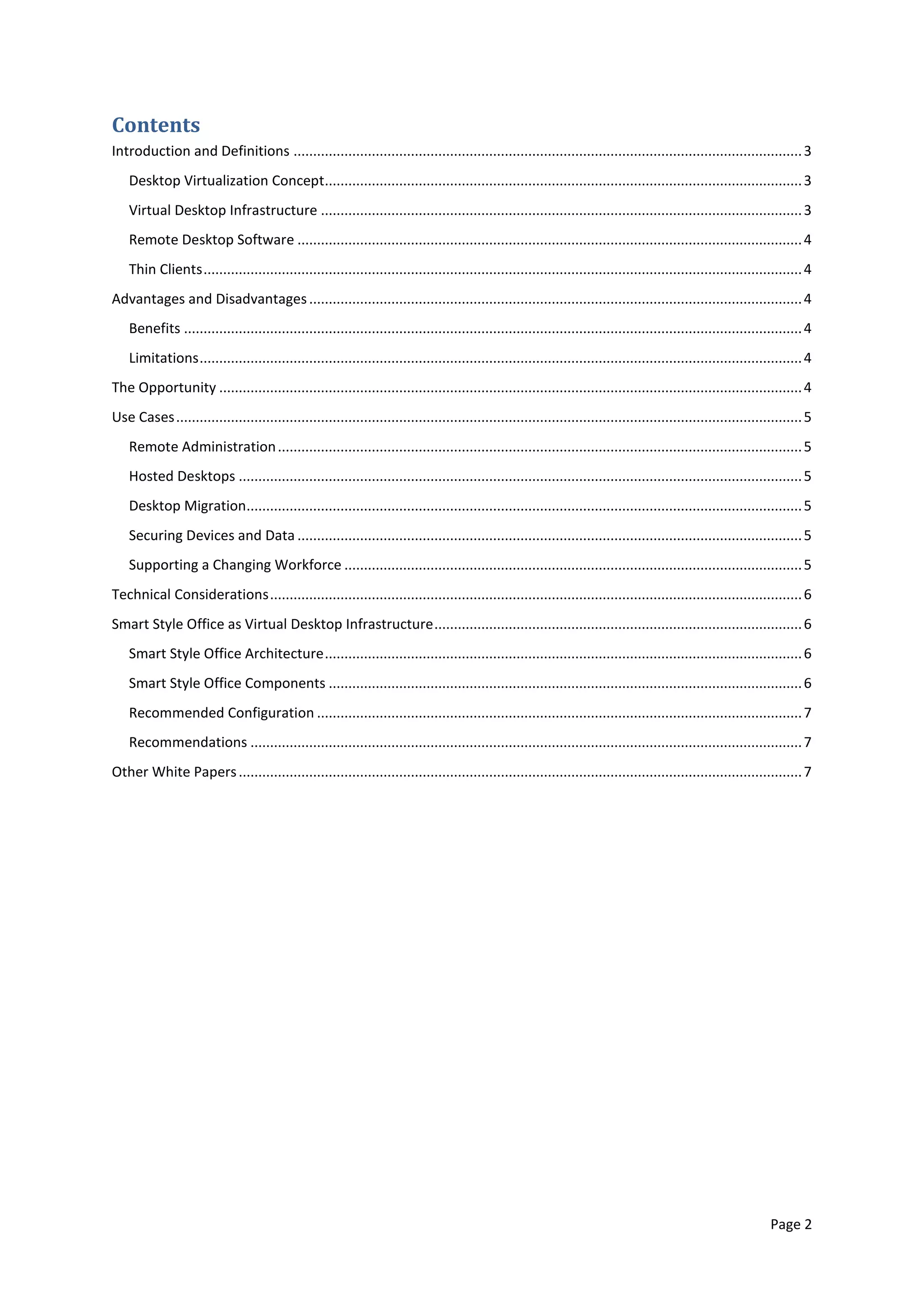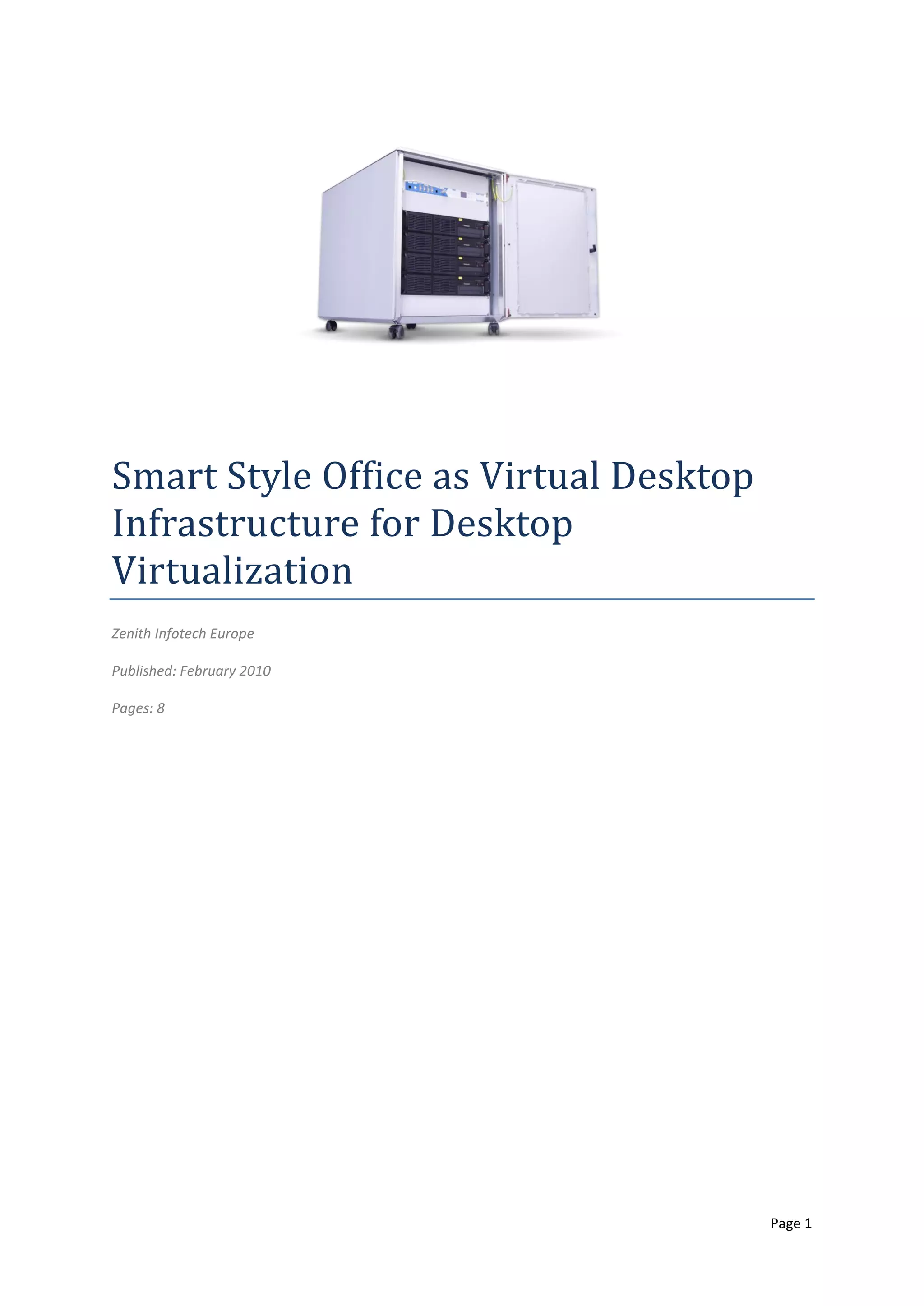 This 8-page document discusses desktop virtualization using Smart Style Office as a virtual desktop infrastructure (VDI). It defines key concepts like desktop virtualization, VDI, and thin clients. It outlines advantages like lower costs, improved manageability and security. Use cases include remote administration, hosted desktops, desktop migration, and supporting a changing workforce. It then describes the Smart Style Office architecture and components and provides recommendations for configuration.