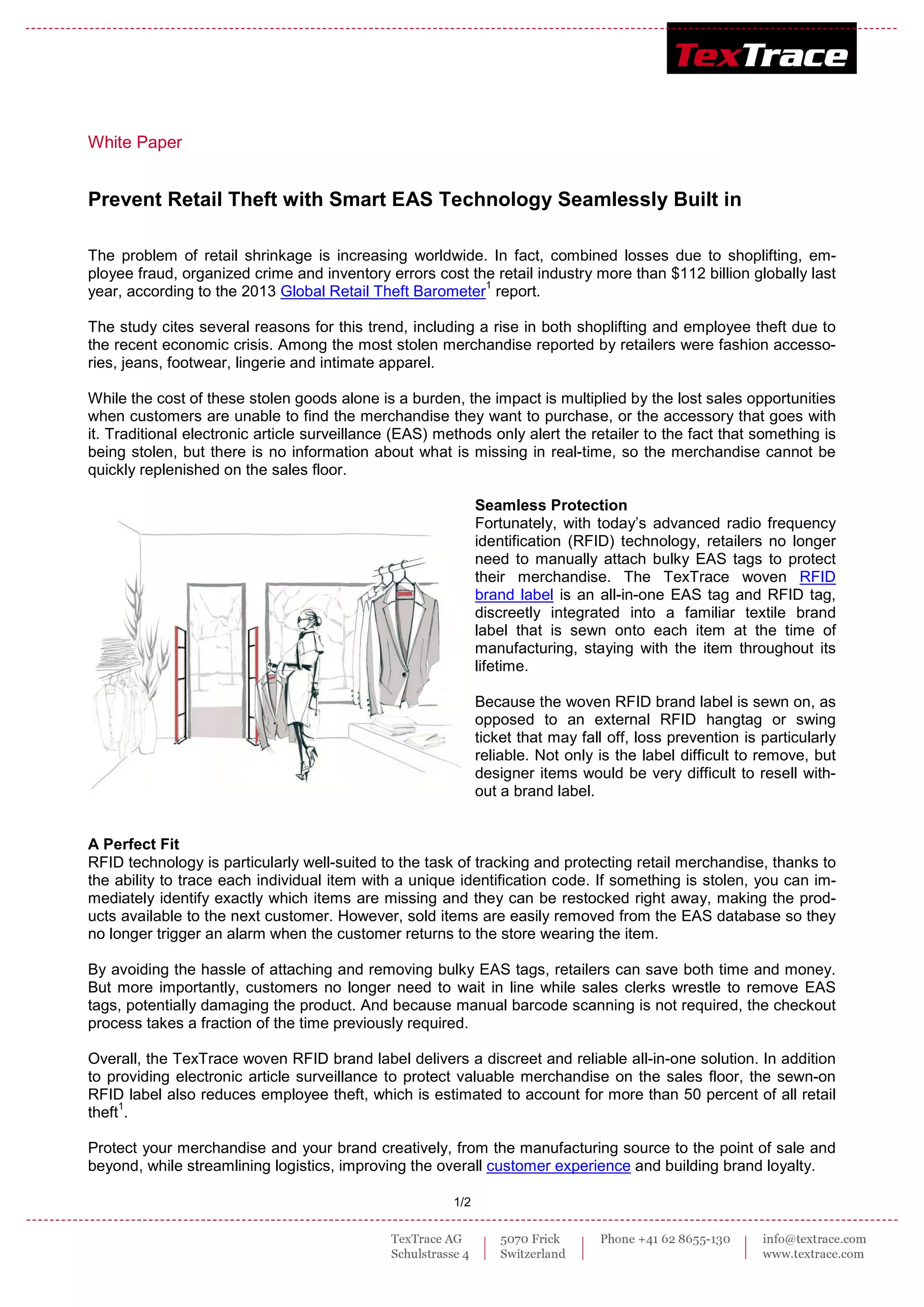 The document discusses the increasing problem of retail shrinkage, costing the industry over $112 billion annually due to theft and inventory errors. It introduces Textrace's woven RFID brand label, which integrates EAS and RFID technology for superior theft prevention and inventory management. This innovative solution improves customer experience by streamlining the checkout process and reducing employee theft, while enhancing brand protection.