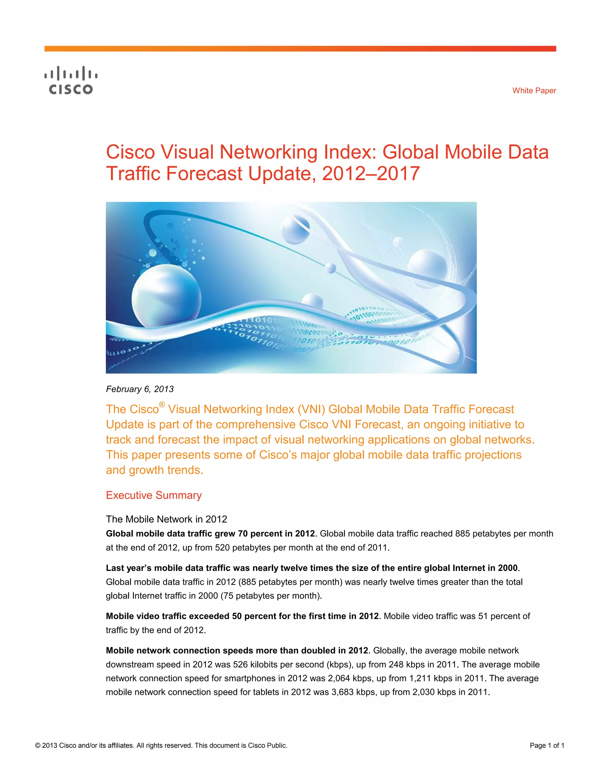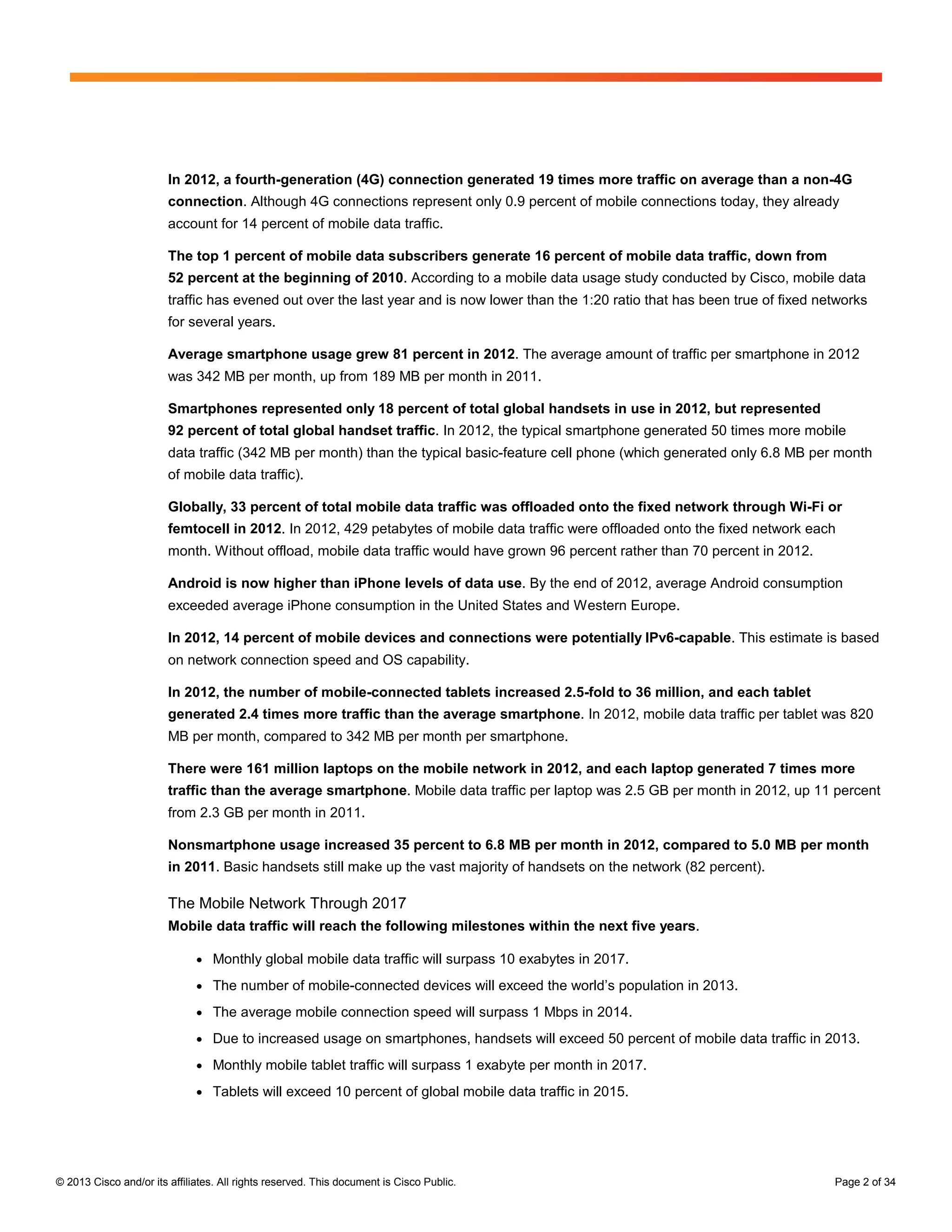 Global mobile data traffic grew 70% in 2012 and is projected to increase 13-fold by 2017 according to Cisco's Visual Networking Index. Key trends driving this growth are the proliferation of diverse mobile devices such as smartphones, tablets, and machine-to-machine modules which generate significantly more data than basic phones. Average traffic per device is also increasing rapidly as users consume more mobile video and content on higher-speed 4G networks. By 2017 over two-thirds of global mobile data traffic will be for video.