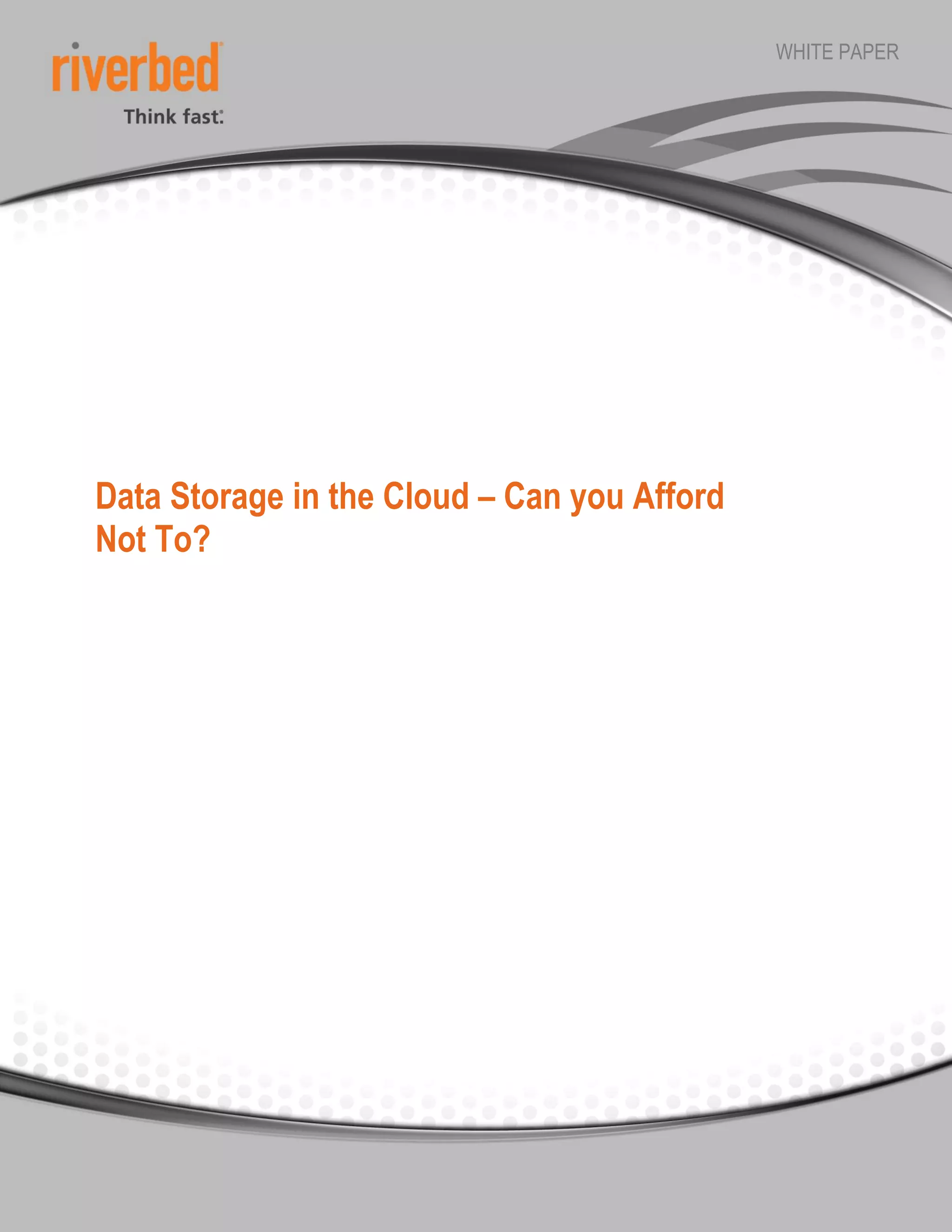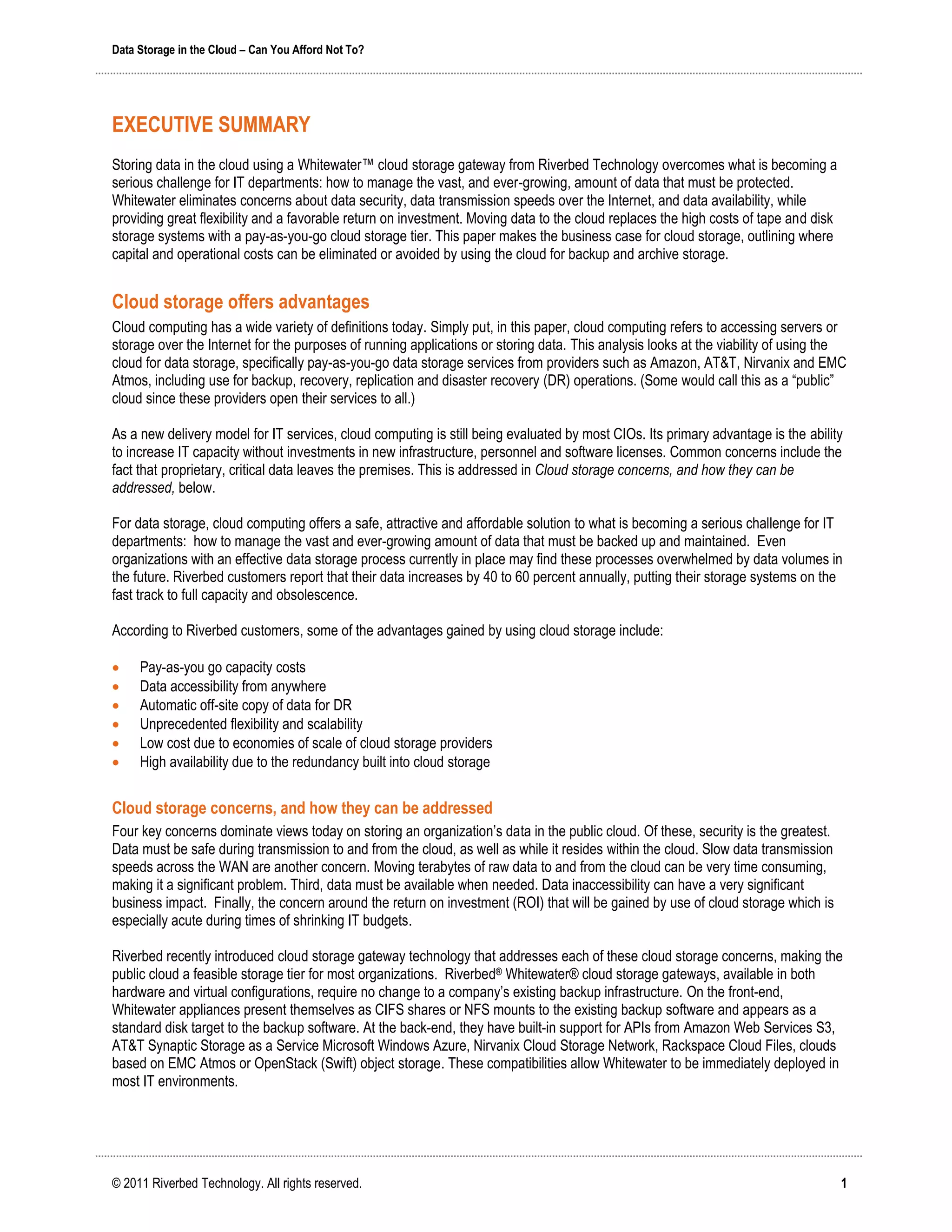 The document discusses the advantages of using cloud storage over traditional tape or disk storage methods. It outlines how Riverbed's Whitewater cloud storage gateway addresses key concerns with cloud storage like security, transmission speeds, and data availability. Customers that have implemented Whitewater report significant cost savings from eliminating tape infrastructure costs and storage array purchases and being able to back up more frequently due to increased speeds.