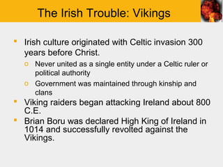 The document summarizes the history of separatist terrorism in Ireland and the Basque region of Spain. In Ireland, separatist violence stemmed from British domination and cultural suppression of the Irish people dating back to the Norman conquest. This led to the formation of groups like the IRA who used terrorism in campaigns for Irish independence and against British rule, particularly in Northern Ireland. In the Basque region, separatist violence by ETA was a response to the suppression of Basque culture and identity under Franco's fascist regime in Spain. ETA used terrorism from the 1960s onwards in their fight for an independent Basque state.