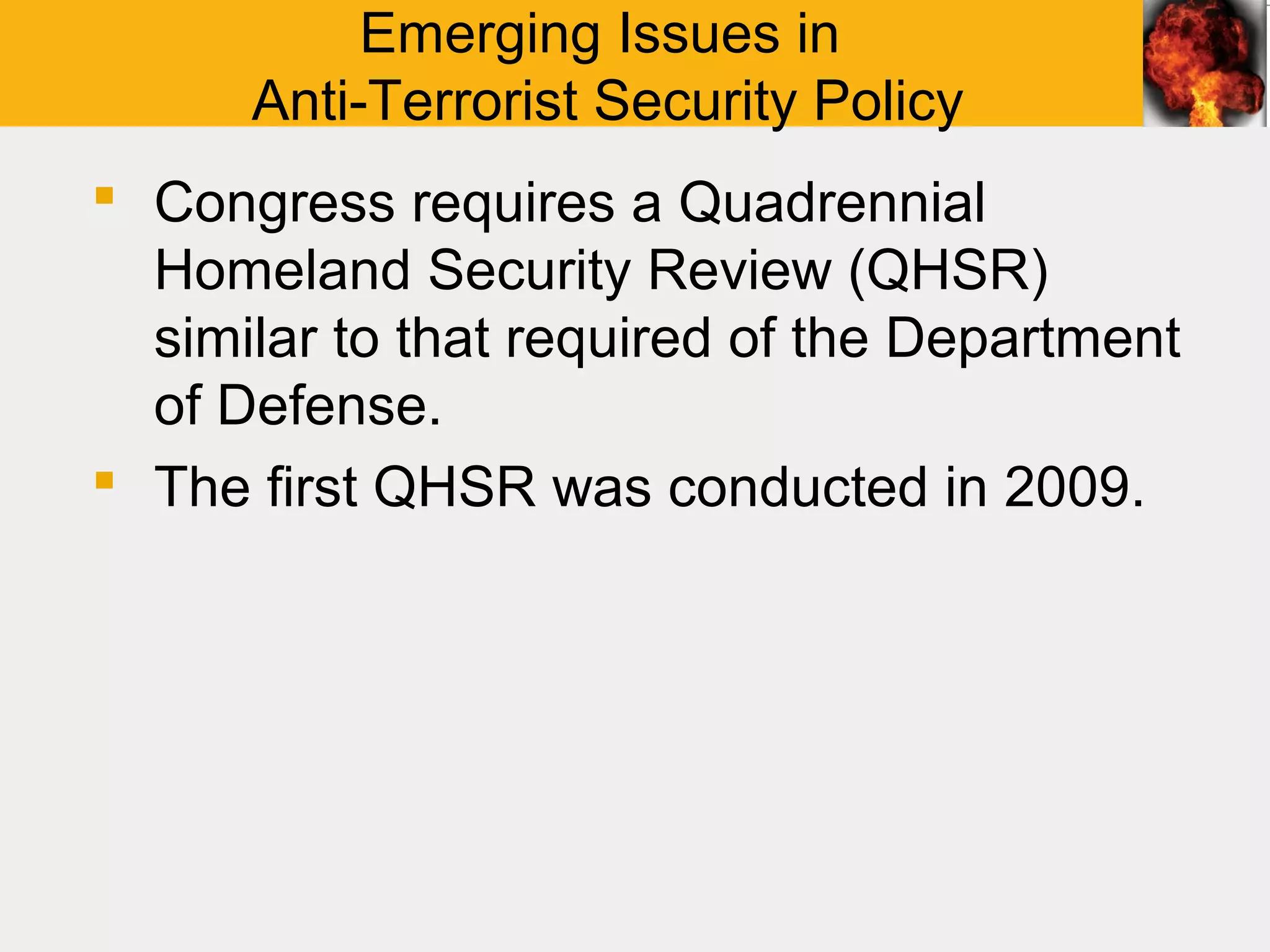 The document discusses several key issues in homeland security and anti-terrorism efforts. It outlines the requirement for regular reviews of homeland security strategy. It also discusses the need for improved communication and information sharing between federal agencies and with private industries. Finally, it examines various challenges such as absorbing potential future attacks, balancing prosecution and intelligence efforts, and addressing both domestic and international terrorism threats going forward.