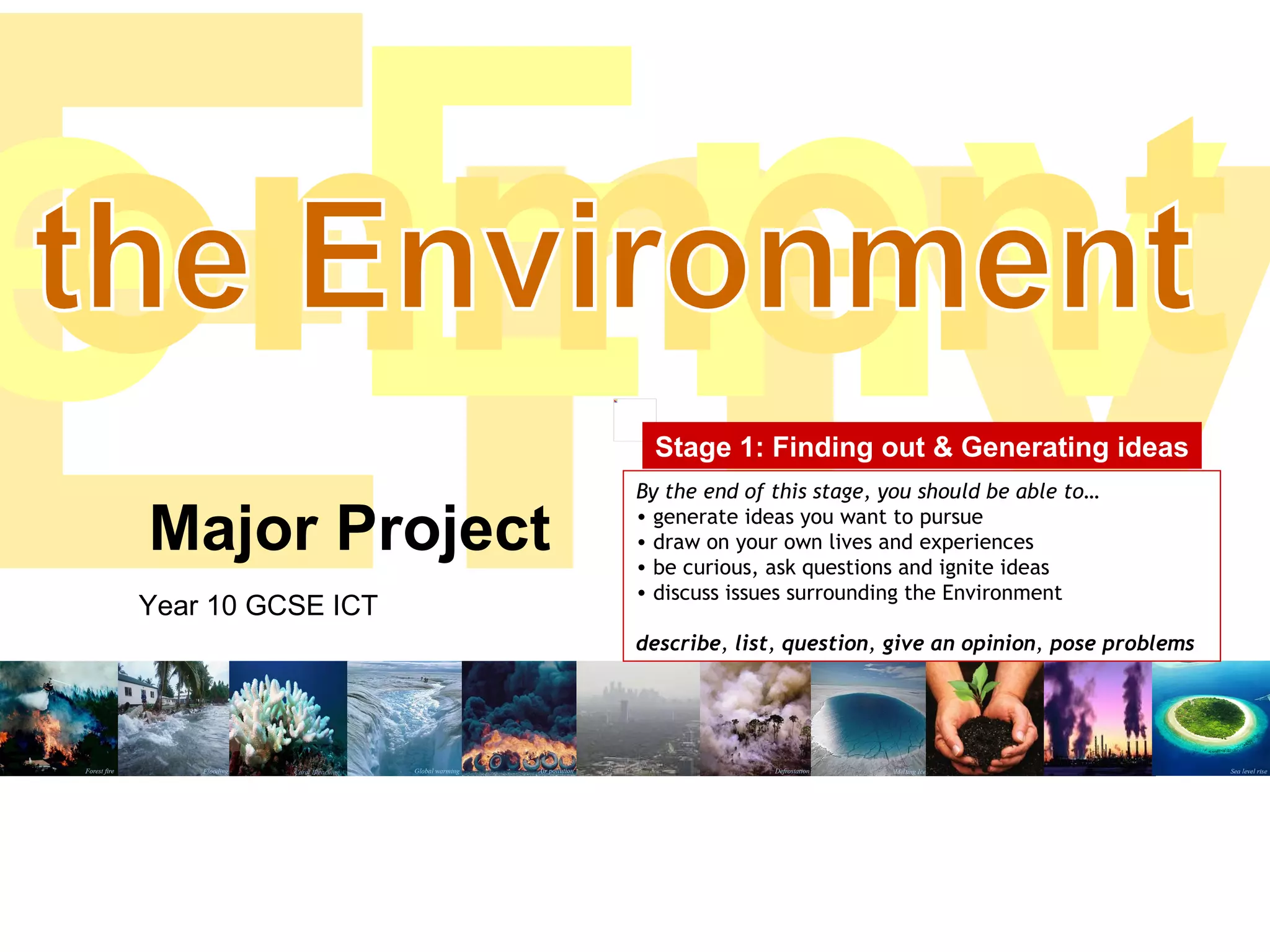The document outlines the stages of a major project on GCSE ICT with a focus on the environment: