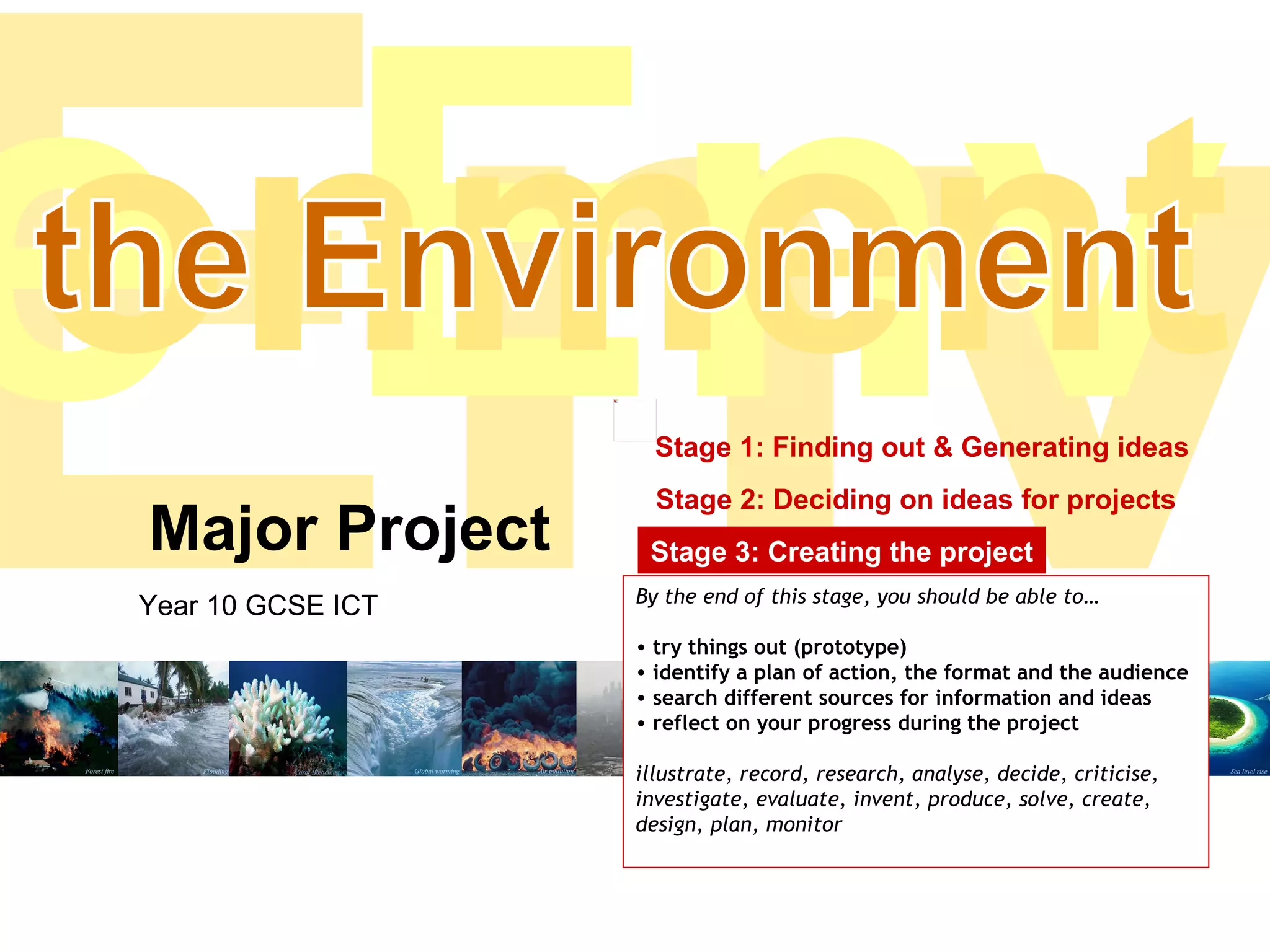The document provides guidance for students completing a major project for their GCSE ICT course. It outlines the four stages of the project: finding out and generating ideas, deciding on project ideas, creating the project, and presenting the finished project. It includes examples of potential project topics, questions to consider, and tools to use at each stage.