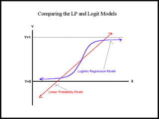 This document provides an introduction and overview of logistic regression. It describes why logistic regression is used when the dependent variable is limited and not continuous. Maximum likelihood estimation is used to estimate the coefficients. The coefficients can be interpreted as odds ratios. The performance of the logistic regression model is evaluated using measures like the model chi-square, percent correct predictions, and pseudo R-squared. Potential problems like omitted variables, irrelevant variables, and structural breaks are also discussed.