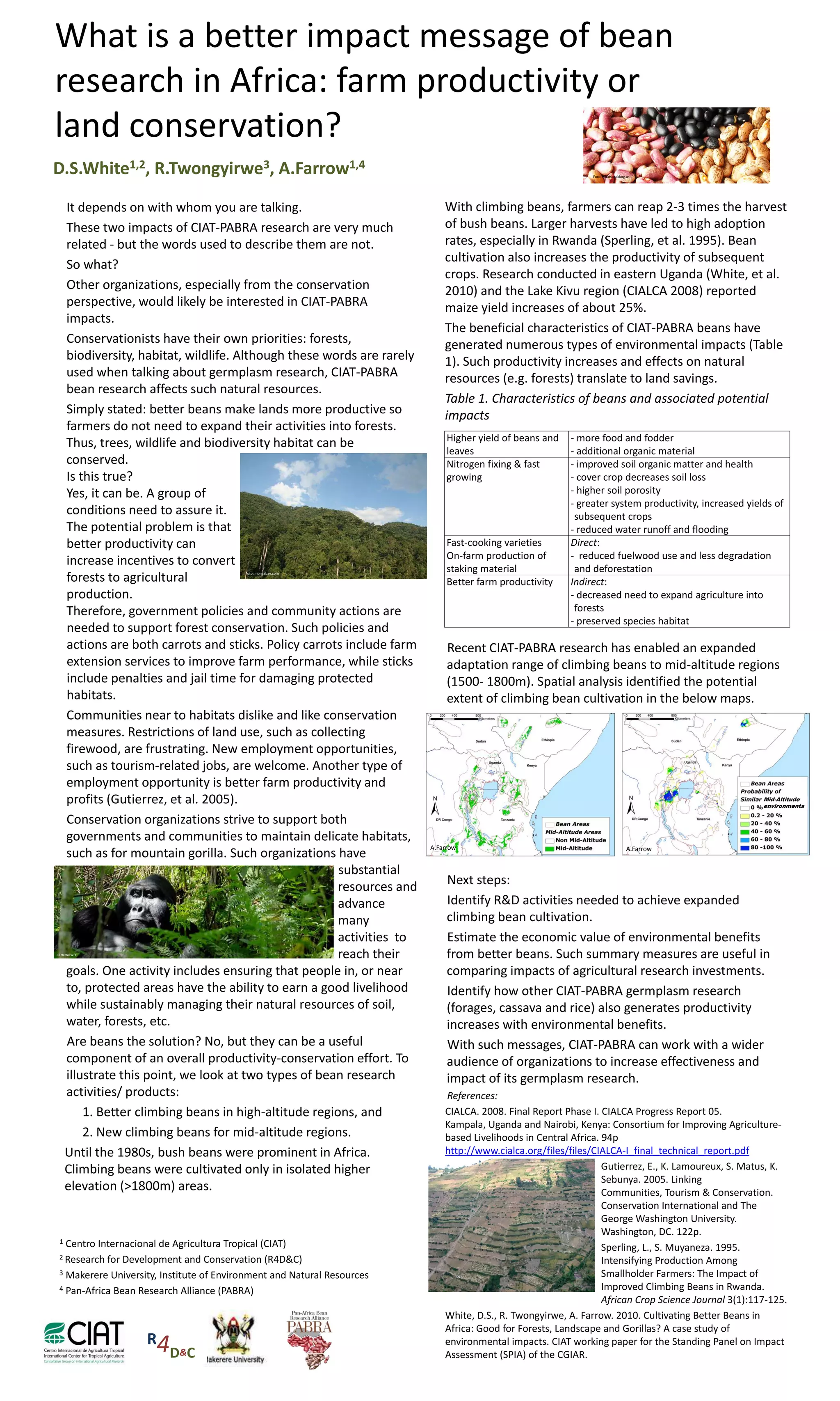 This document discusses the impacts of bean research in Africa conducted by CIAT-PABRA, focusing on whether increased farm productivity or land conservation makes a better message. The research found that higher-yielding climbing bean varieties led to increased crop harvests and maize yields, reducing the need to expand farms into forests. This land sparing effect benefits conservation. However, policies and alternative livelihoods are also needed to encourage forest protection as increased incomes could otherwise lead to more deforestation. The document argues that messaging the environmental benefits of productivity gains, like those from new climbing bean varieties, can engage conservation organizations in supporting agricultural research.