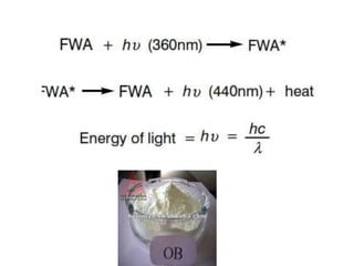 Optical brightening agents (OBAs) are colorless dyes that emit visible blue light when exposed to UV light, making white fabrics appear brighter. They work by absorbing UV light and re-emitting it at a longer, visible wavelength. Historically, OBAs were first used as bleaching auxiliaries in the 1800s and were derived from horse chestnut extracts. Modern OBAs are typically derived from stilbene or triazine compounds. While OBAs improve whiteness, they generally have poor light and wash fastness. Their effects also depend on fiber type and conditions like pH and temperature.