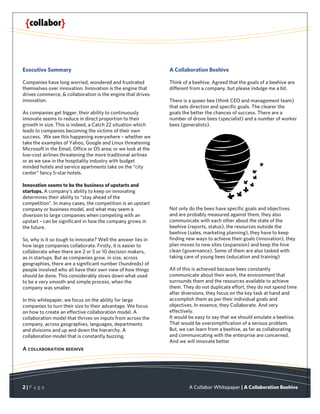 This document provides guidance on how large companies can improve collaboration to drive innovation. It recommends establishing clear goals, breaking down organizational silos, using collaboration software, engaging employees, and analyzing collaboration data. The key idea is to create a "collaboration beehive" where employees communicate effectively like bees in a hive to accomplish goals in a focused, non-duplicative way and drive innovation.