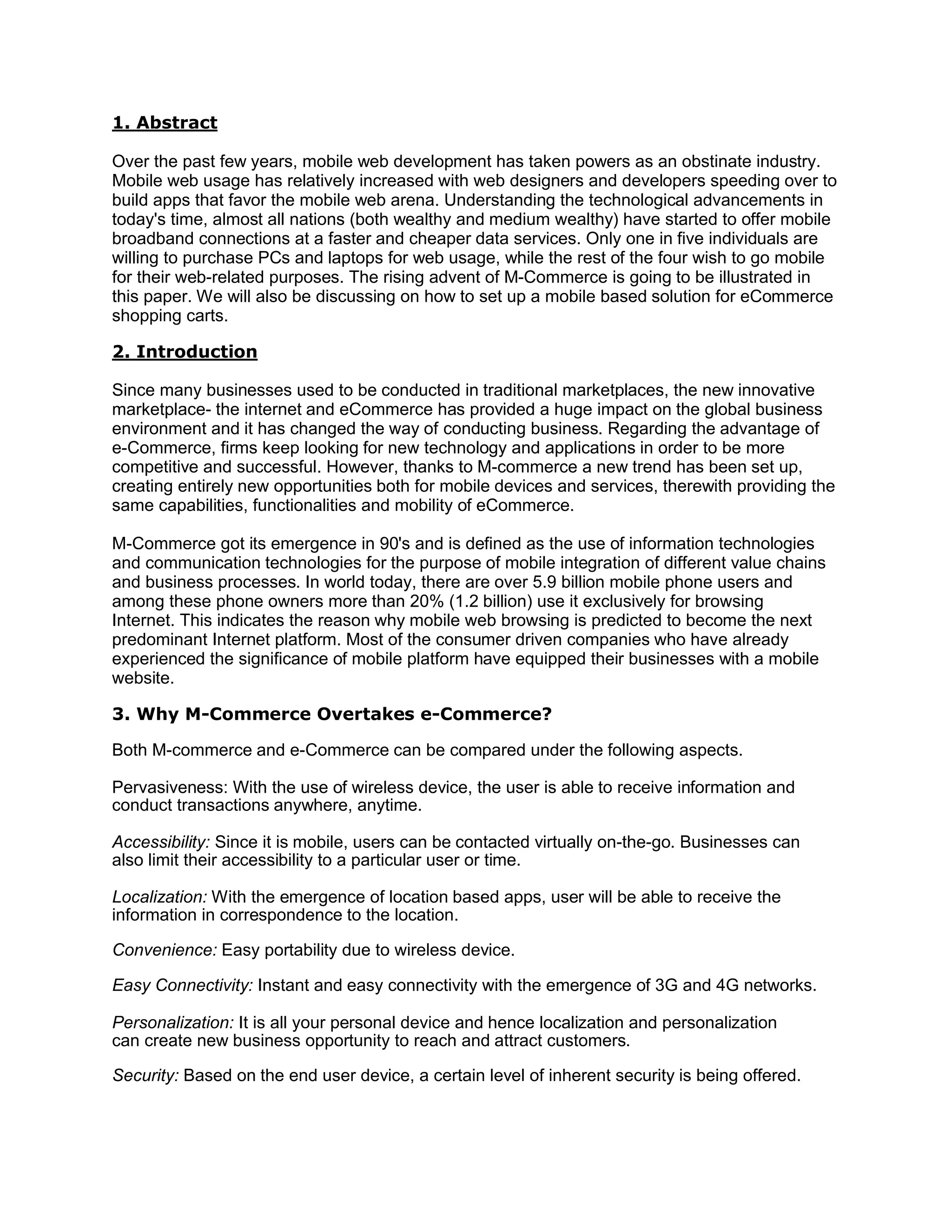 This document provides guidelines for setting up a mobile-based ecommerce solution. It discusses the benefits of m-commerce over e-commerce, including pervasiveness, accessibility, localization, convenience, and personalization. It also outlines characteristics of an m-commerce site like mobility and reachability. The document then gives recommendations for developing a mobile-friendly site, such as using fluid layouts, avoiding flashy scripts, optimizing images, and keeping page sizes small. The overall goal is to make ecommerce sites accessible on mobile devices.