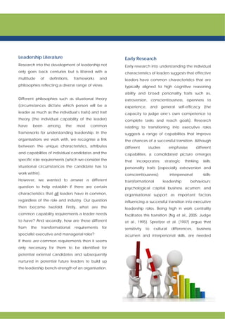 The white paper by Peter Zarris emphasizes the need for a capabilities approach in assessing and developing leadership in organizations, addressing the gap between existing methods and the complex challenges leaders face today. It outlines common capabilities for effective leadership, validated through extensive research, and introduces the Executive Capabilities Framework (ECF) that distinguishes between technical skills and the competencies necessary for senior roles. The research identifies five key capabilities crucial for executive effectiveness: people leadership, driving results, business development, strategic commercial orientation, and broad-based influencing.