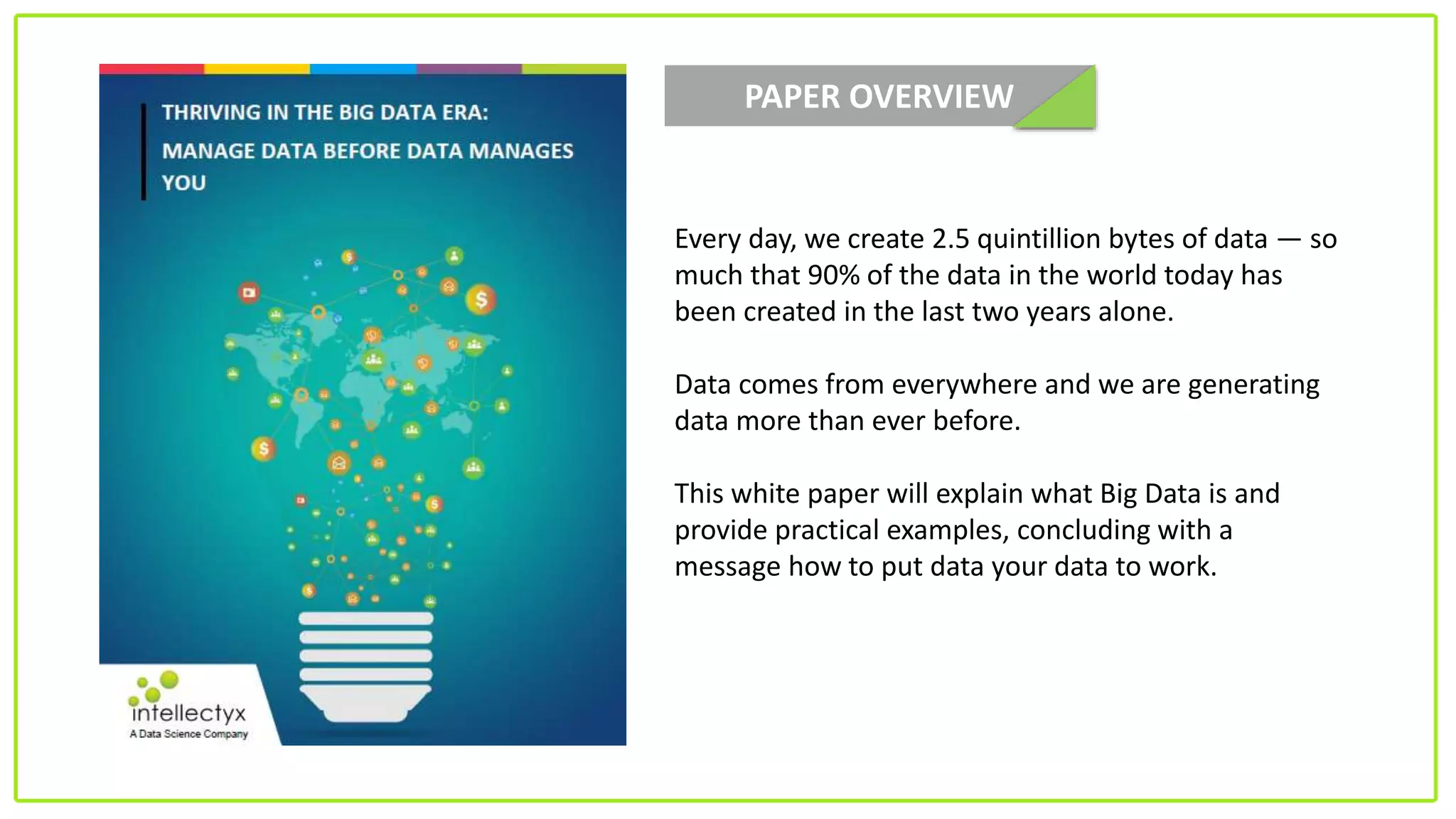 This white paper explores the concept of big data, emphasizing its significance beyond mere size, and introduces the 'four Vs' of big data: velocity, volume, variety, and variability. It provides practical applications including fraud detection and social media analytics, highlighting how successful companies leverage data for insights and optimizations. The conclusion stresses that the true measure of a company's success lies in its ability to effectively analyze and utilize data.
