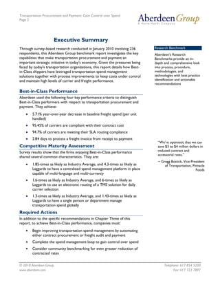 The document is a research report that analyzes transportation procurement and payment processes. It finds that the best-performing companies ("Best-in-Class") achieve significant cost savings and carrier compliance through automated and integrated spend management solutions. The Best-in-Class are more likely than peers to use transportation management systems for routing and specialized tools for freight audit and payment. The report provides recommendations for improving processes based on the Best-in-Class approaches.