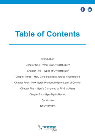 This document provides an overview of how marine gyrostabilizers work to reduce ship rolling. It begins with definitions, explaining that a gyrostabilizer uses a spinning flywheel mounted on gimbals to generate torque that counters rolling motions. Subsequent chapters discuss different gyrostabilizer types, how the gyroscopic effect generates stabilizing torque automatically in response to rolling, and why gyrostabilizers provide smoother stabilization than fin stabilizers.
