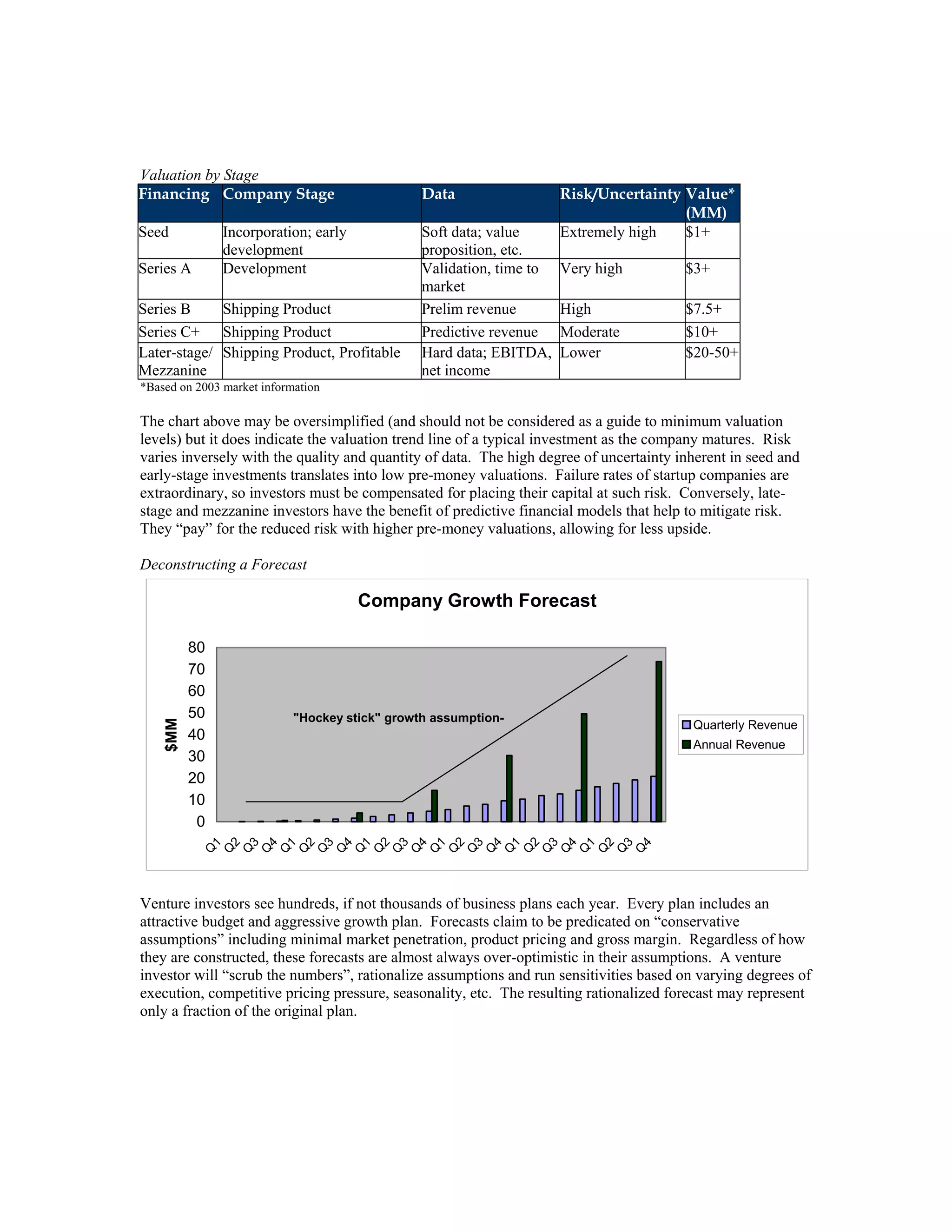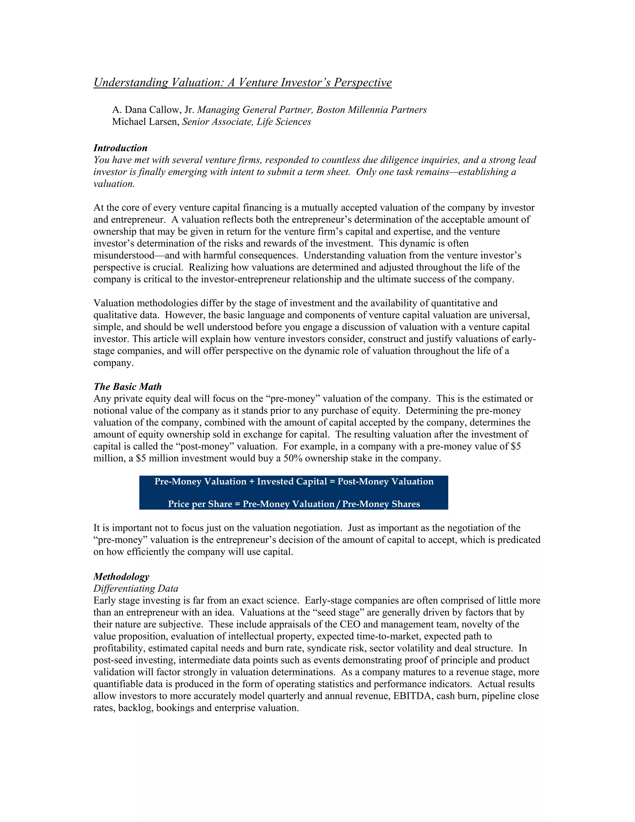 The document discusses how venture investors determine valuations for early-stage companies from the investor's perspective. It explains that valuations are based on both qualitative and quantitative factors depending on the company's stage. In the early stages, valuations are largely subjective based on soft factors. As companies mature and achieve milestones, valuations are based more on quantifiable data like revenue and burn rate. The document also outlines how valuations typically increase with each new round of financing as risk decreases with demonstrated progress and more data.