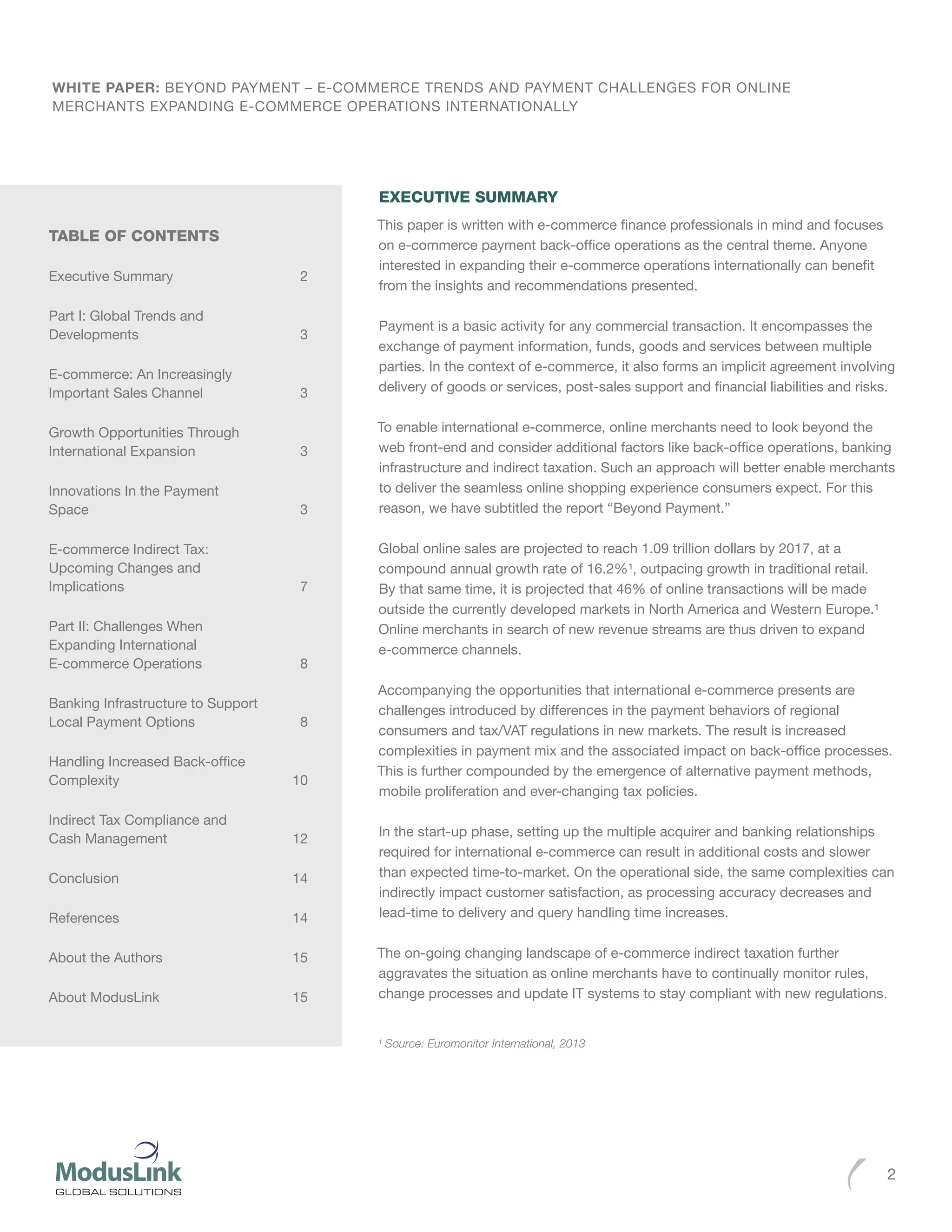 This white paper discusses key trends and challenges in international e-commerce, emphasizing the importance of back-office operations and payment infrastructure for online merchants. It highlights the projected growth of global online sales and the complexities introduced by varying payment behaviors and tax regulations across regions. Additionally, the report outlines various innovative payment solutions and the necessity for merchants to adapt to an evolving compliance landscape to enhance customer satisfaction and operational efficiency.