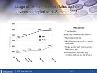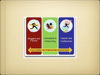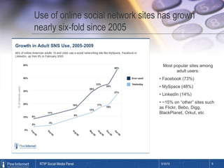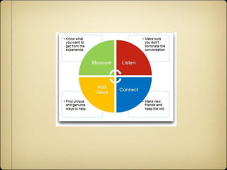 The document provides an overview of social media and its importance for businesses. It discusses the major social media platforms like Facebook, Twitter, and LinkedIn and their large user bases. It emphasizes that social media allows businesses to connect with customers globally and should be an integral part of marketing strategy. The document concludes by offering tips for businesses to get started with social media, including listening, engaging, providing value, and continuously tweaking their approach.