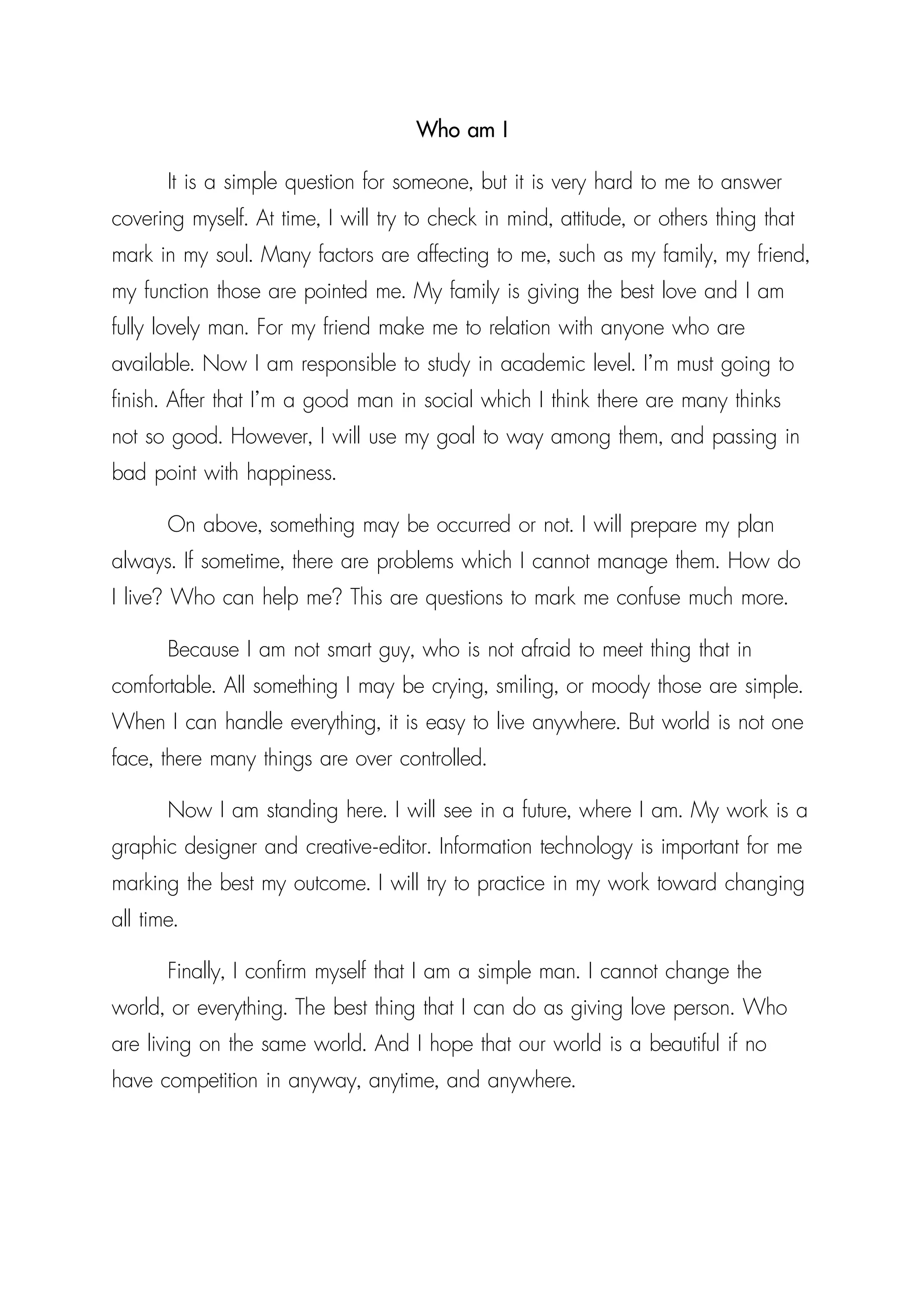 This document is a reflection on identity and purpose. The author explores how their family, friends, and responsibilities shape who they are. While they aim to be happy and handle challenges, they acknowledge the world presents many uncontrolled factors and uncertainties. The author works as a graphic designer and hopes to improve their skills over time through practice. Ultimately, they see themselves as a simple person focused on spreading love rather than changing the world.