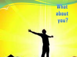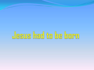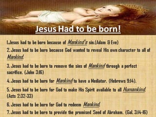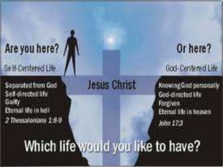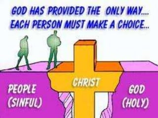 This document discusses the key aspects of salvation through Jesus Christ. It begins by establishing that all humans are sinners separated from God. It then explains that God, through his love, sent Jesus to die for mankind's sins so that believers may be saved. The conditions for receiving salvation are to repent of sins and have faith in Jesus. Those who accept Jesus as their savior through prayer will be forgiven of their sins and granted eternal life with God.