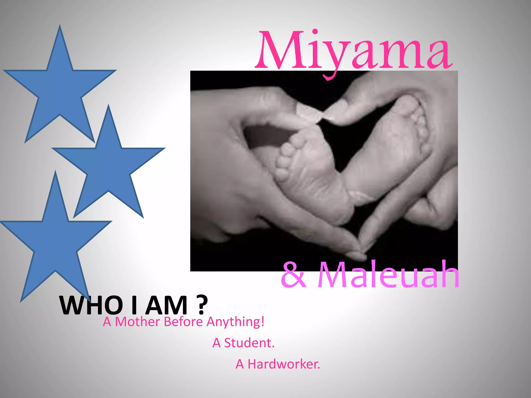 This document introduces Miyama, a mother and student who has a passion for fashion. Her priorities in life include success and loyalty. She previously wanted to be a lawyer but is now focused on becoming a hygienist in the medical field. Her short-term goal is to stop going to Southlake, and her long-term goal is ensuring her daughter grows up to be the best she can be.
