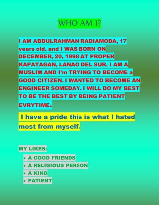 The document introduces Abdulrahman Radiamoda, a 17-year-old Muslim from Lanao del Sur, Philippines. He was born on December 20, 1998 and wants to become an engineer. He enjoys spending time with friends, practicing his religion, and engaging in sports, entertainment, and reading. He dislikes bullying, judging others, hurting people, and breaking promises. His goal is to become a good citizen through patience and by following his parents' guidance.