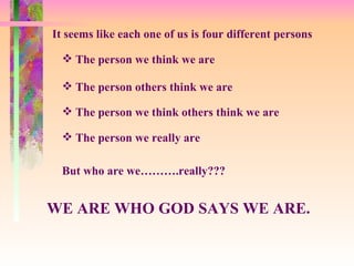 The document explores identity from a Christian perspective, detailing how individuals are perceived in different ways before and after accepting Christ. It emphasizes that according to scripture from Ephesians, believers are blessed, chosen, adopted, redeemed, and empowered to live as part of God's family and fulfill a divine purpose. It encourages Christians to live out their identity by embracing their new life in Christ and utilizing their spiritual gifts.