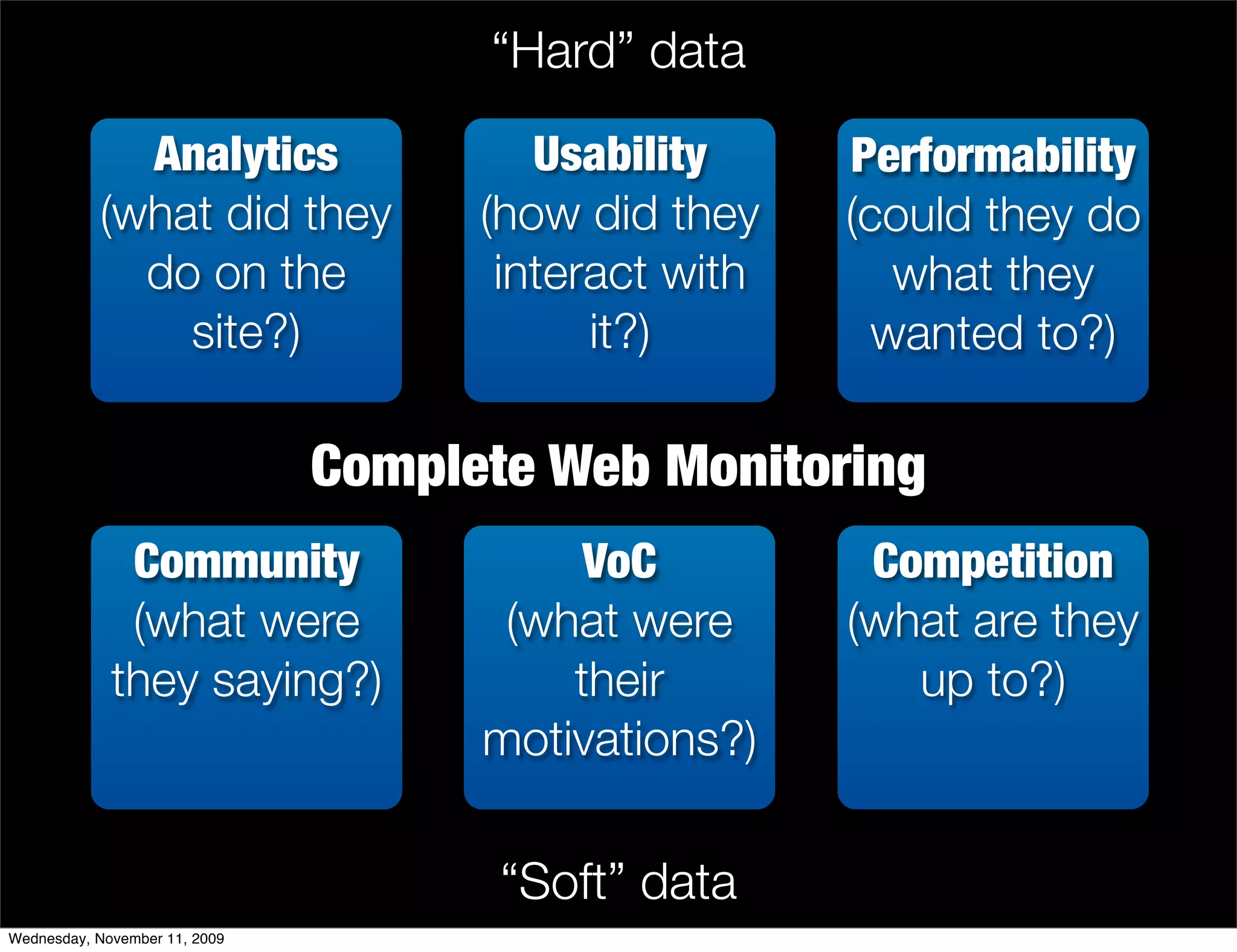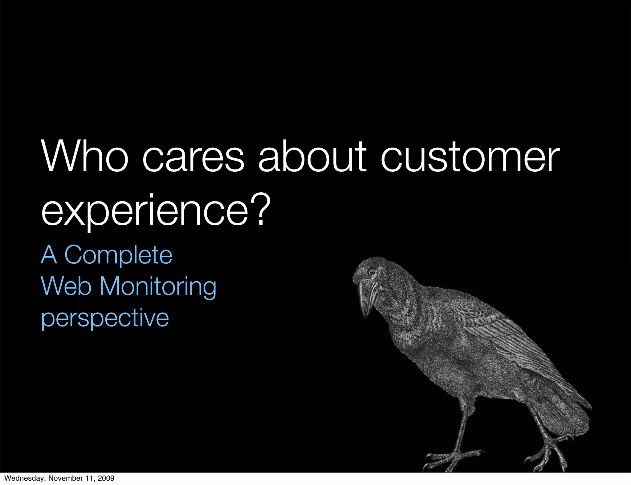 The document discusses the importance of customer experience from a web monitoring perspective, highlighting the relationship between website performance, user interaction, and business outcomes. It emphasizes the need for analytics and optimization to improve customer engagement and reduce costs associated with call centers. The conclusions suggest that a clear link exists between website performance and key business performance indicators, advocating for collaboration between IT and marketing teams.