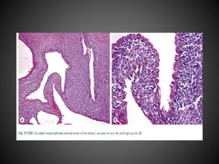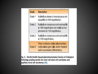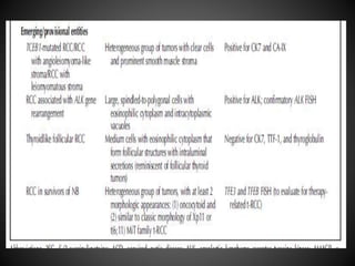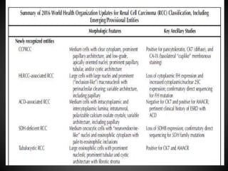 The document summarizes updates to the 2016 WHO classification of renal cell carcinoma compared to the 2004 classification. Key changes include recognizing RCC as distinct subtypes based on histology, architecture, location, associated diseases and molecular alterations. The 2016 classification adds 9 new renal tumor entities, separates some subtypes, and groups familial and sporadic forms of RCC together. It provides greater specificity in RCC diagnosis and classification based on recent advances in understanding RCC pathogenesis and genetics.