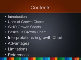 This document discusses pediatric growth charts. It begins by introducing growth charts and their uses, such as monitoring a child's growth over time and identifying high-risk children. It then focuses on the WHO growth charts, describing their development based on a multinational study and how they establish breastfeeding as the biological norm. The basics of growth chart construction and interpretations are explained. Advantages include being a gold standard and better suiting aboriginal populations, while limitations include not reflecting all feeding practices and potentially discouraging breastfeeding.