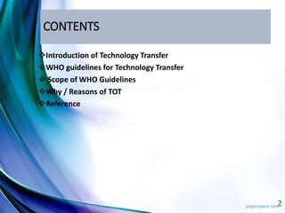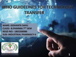 This document provides information about technology transfer in the pharmaceutical industry. It defines technology transfer as the logical procedure that controls the transfer of any process along with documentation and expertise between development and manufacturing sites. The WHO guidelines for technology transfer provide a flexible framework to guide the transfer process with a focus on quality. The scope of the WHO guidelines includes guidance for transferring manufacturing processes of APIs, packaging, and all dosage forms. Reasons for technology transfer include a lack of manufacturing capacity, resources, or marketing capabilities.