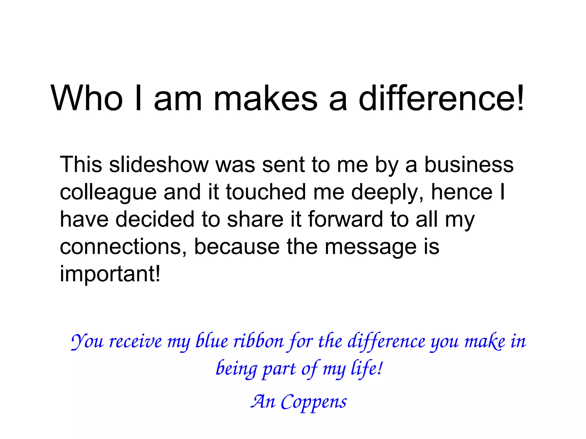 The document is a heartfelt message shared by An Coppens, emphasizing the importance of individual contributions to one another's lives. It originated from a slideshow sent by a business colleague that resonated deeply with the author. The author expresses gratitude and appreciation by awarding a 'blue ribbon' to those who make a positive difference.