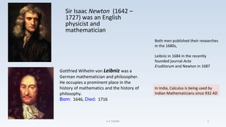 The document discusses the origins of calculus and whether it was invented by Newton, Leibniz, or Indian mathematicians. It provides background on Newton, Leibniz, and notes that Indian mathematicians were using concepts of calculus as early as the 10th century. It discusses several Indian mathematicians who made contributions involving concepts now seen as integral to calculus, such as derivatives, integrals, power series, and infinitesimals. These contributions began as early as the 10th century and continued through the Kerala school of the 14th-16th centuries, predating Newton and Leibniz by several centuries.
