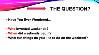 Factory workers in the late 19th century worked 10-16 hours a day, 7 days a week, which made them unhappy. Some factory owners agreed to close on Sundays to allow workers to attend church. In 1926, Henry Ford decided to close his Ford Motor Company for two days each weekend. This gave workers free time to go on trips and buy Ford cars. While most people now have weekends off, some essential workers like firefighters, police officers, and doctors work every day.