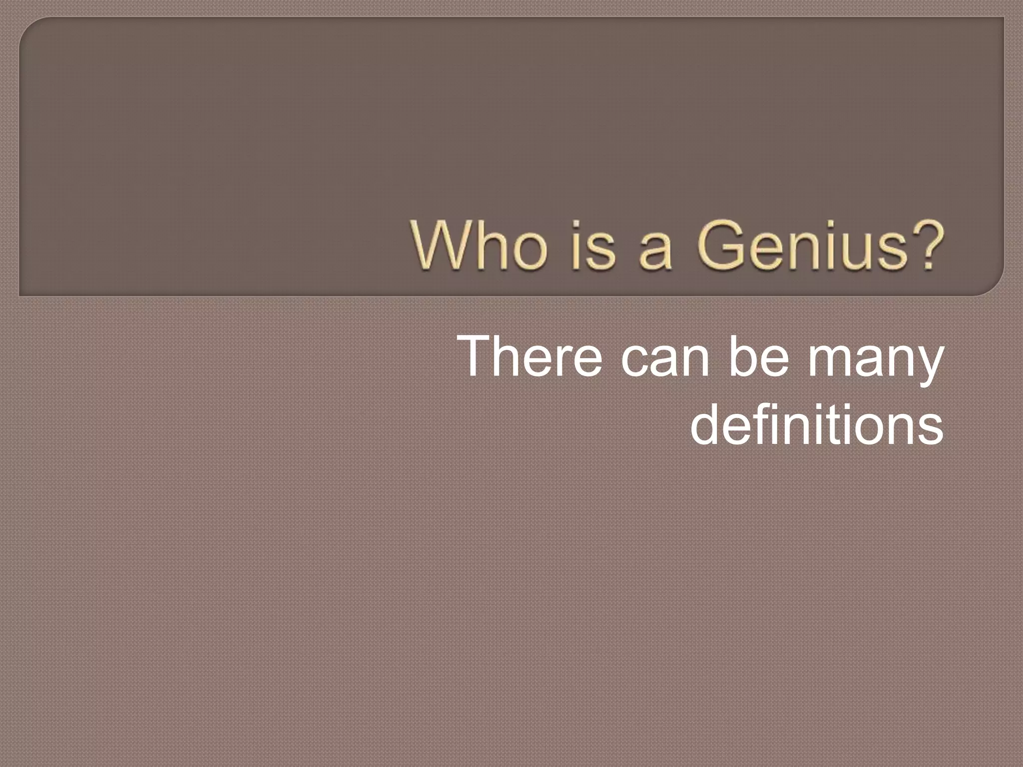 The document discusses the concept of genius, defining it as extraordinary intellectual capability or exceptional skills. It highlights recognized figures like Einstein and Edison, and also mentions unsung geniuses in various fields. The text encourages readers to engage with the content and offers best wishes to aspiring geniuses.